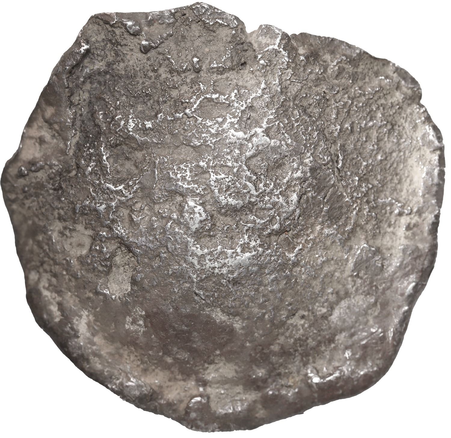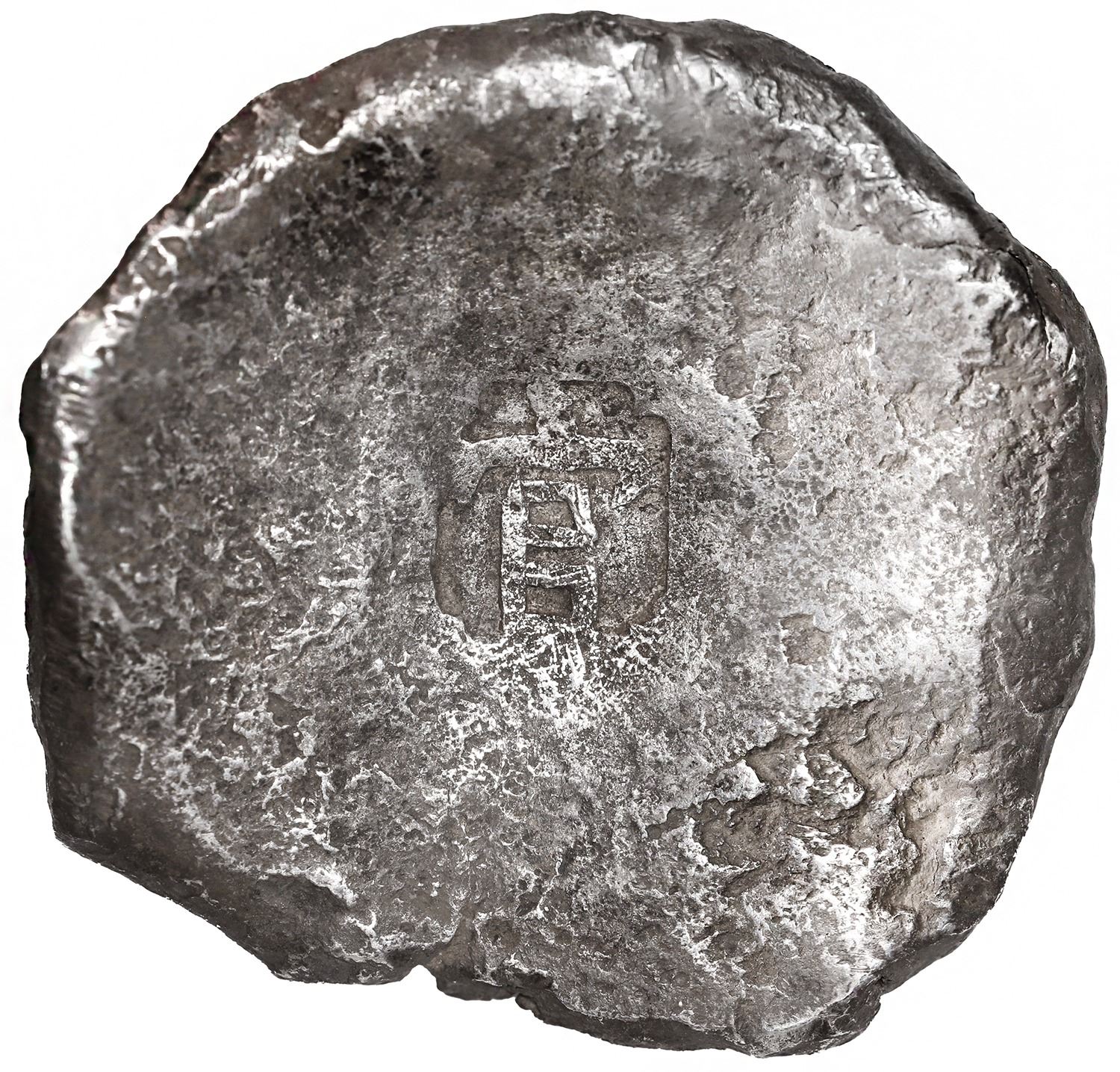 Small Chinese silver tael customs ingot, Wukao Dabing, ca. 19th century, 36.00 grams, about 95% fine. BMC Class LXXX; cf. Zhong Guo Li Shi Yin Ding, p. 85 no. 262. 36.00 grams. Up to 1½" in diameter and 1/8" thick. Crude single casting with uneven metal flow and a slightly concave pancake form, bearing one official stamp reading "Guan" in center, with typical casting flaws and circulation wear and a rich, even gray patina, XRF-tested at about 95% silver, with 1% iron and 2% lead and 0.5% gold. Little ingots like these were cast to a regulated fineness and used for the payment of customs duties at official checkpoints known as Guans along major waterways and land routes. Raw silver was purchased directly from furnace workshops and then recast into this form specifically for tariff payments. A scarce and evocative example of Qing period fiscal silver.