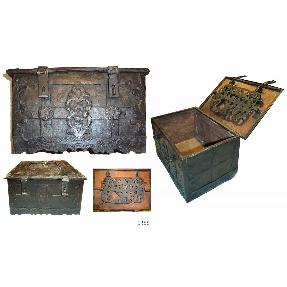 Small "Nuremburg" chest, early 1600s(?), with original key. 13" x 10" x 8-1/2". Classic design with 2-bolt locking mechanism behind ornate plate under lid, keyhole in top, false lock in front, ornately strapped exterior with two padlock straps in front, plain interior with no inner box, unusually small (consignor calls it a "queen's chest"), with small handle at top, nice operational condition.