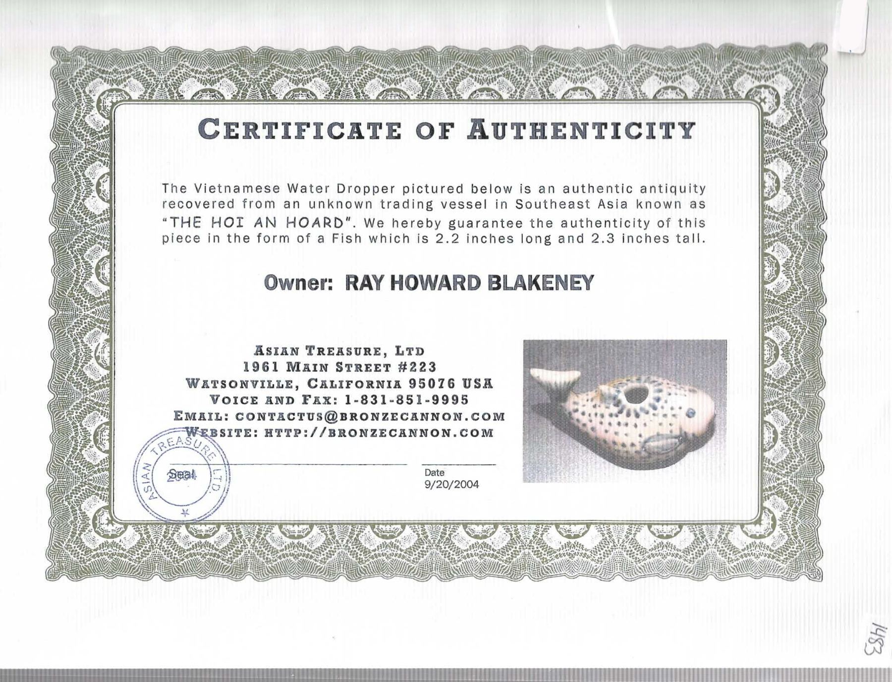 Small, Vietnamese blue-on-white porcelain water dropper in the shape of a fish, ex-"Hoi An Hoard" (late 1400s). 54 grams. roughly 2¾" long, 2" tall. Whimsical fish shape with upturned tail, small hole in his mouth to dribble water onto ink for painting or calligraphy, intact with matte surfaces, and ready for display. From the "Hoi An Hoard" shipwreck (late 1400s), with photo-certificate.