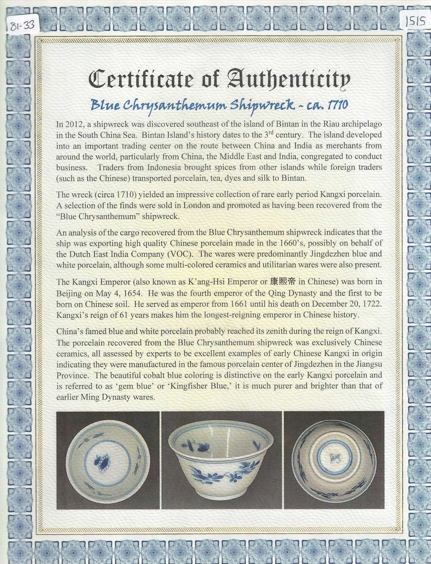Small blue-on-white Chinese porcelain cup with floral design, Kangxi period, ex-"Blue Chrysanthemum" shipwreck (ca. 1710). 47 grams. 3" in diameter at top, 1½" tall. Lovely, well preserved small cup with a flat rather than rounded bottom on the inside, deep-blue floral depictions, smooth glazed finish all over. From the "Blue Chrysanthemum" shipwreck (ca. 1710), with photo-certificate.