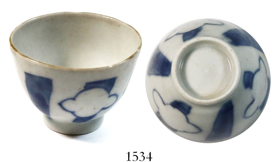 Small, blue-on-white Chinese porcelain teacup, K'angxi period, ex-Ullian. 44 grams, 1-3/4" tall and 2-1/4" in diameter. Completely intact, with some glaze remaining, traces of red overglaze too, simple exterior design of three cloud-like panels with diagonal stripes. With original Real Eight Co. certificate signed by Lou Ullian, which says this cup was "recovered in 1963 by the Real 8 Co. from the Almiranta of the 1715 Fleet. It was one of 11 small cups found." Recovered from: Spanish 1715 Fleet, east coast of Florida. UPDATE: It has come to our attention that this piece was actually recovered from a suspected pirate wreck of the 1720s-30s in the Red Sea during an archeological expedition in the 1970s. The pattern on this cup is distinctive for the Chinese market and would not have ended up on the 1715 Fleet. The salvager subsequently sold it to Ullian, and we surmise that it simply got confused in Lou's estate.