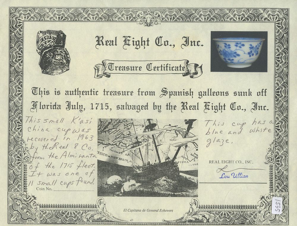 Small, blue-on-white Chinese porcelain teacup, K'angxi period, ex-Ullian. 54 grams, 1-1/2" tall and 2-3/4" in diameter. Fully intact except for tiny frits in rim, typical floral design on inside and outside, some glaze remaining. With original Real Eight Co. certificate signed by Lou Ullian, which says this cup was "recovered in 1963 by the Real 8 Co. from the Almiranta of the 1715 Fleet. It was one of 11 small cups found."