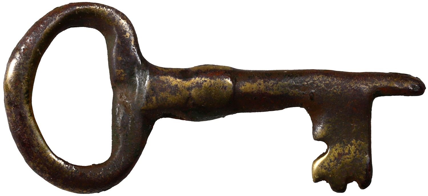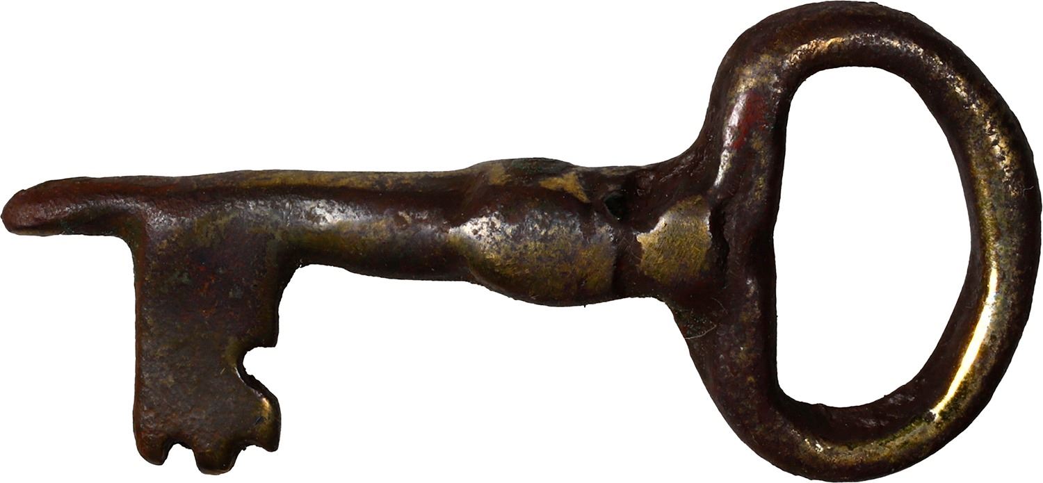 Small brass key for chest or box, ex-Colossus (1798). 5 grams. 1½" long. Hand-forged piece with brassy details, semicircular handle, interesting shape of lock mechanism, probably for a chest or box. From the Colossus (1798), with certificate from the salvors.