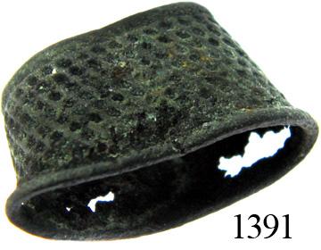 Small brass thimble piece. 2.4 grams, roughly ¾" x ½". A typical sailmaker's thimble with open top, a bit flattened and with tiny tears but otherwise intact and lightly encrusted with patina. Recovered from: Spanish 1715 Fleet, east coast of Florida.