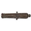 Small, bronze signal cannon, mid-1800s. 15 lbs, 13-1/2" long. Compact, heavy cannon, matte brown all over with small fuse at top on one end and patinated muzzle at the other.