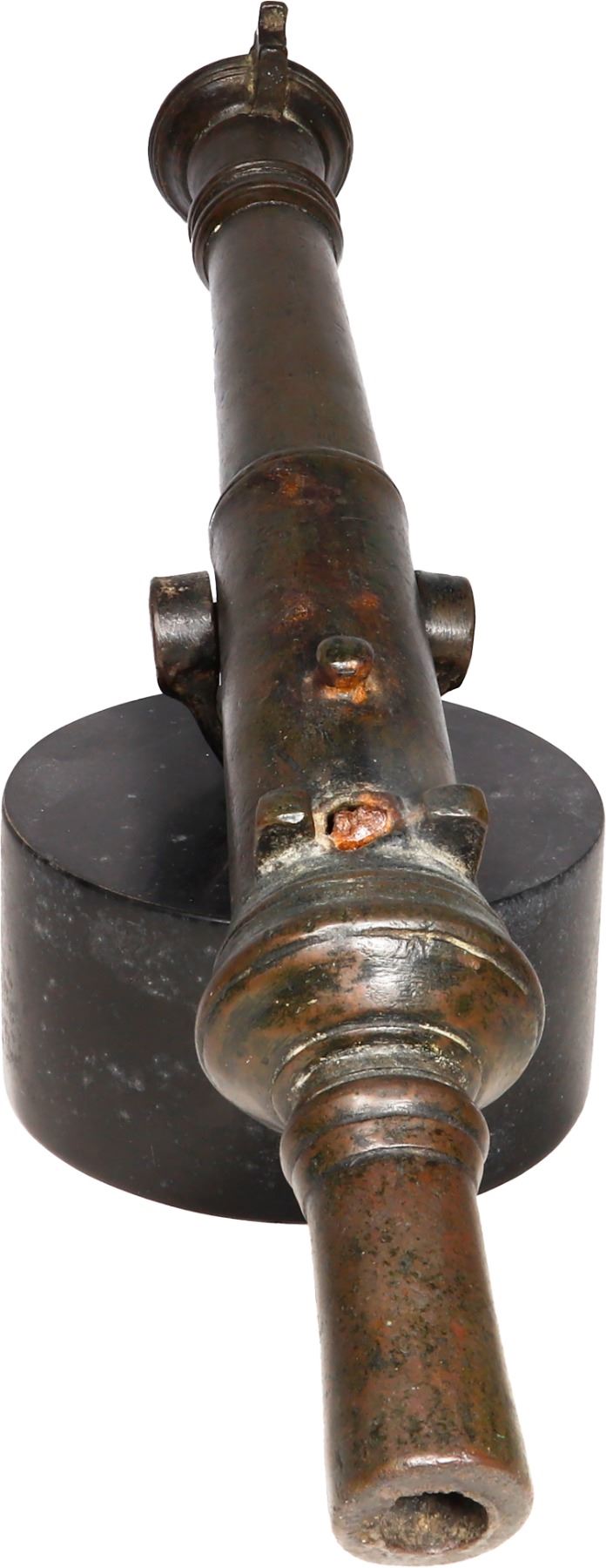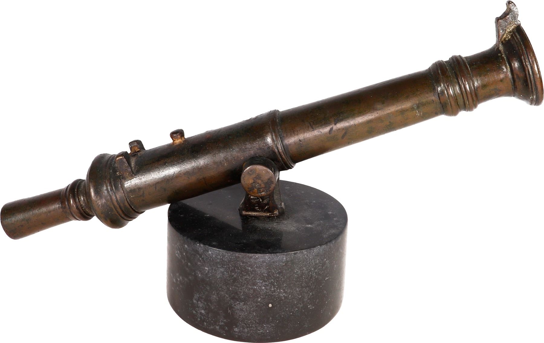 Small bronze signal cannon with yoke and stand, probably 1800s. 13 lb. 18" long. Like its much larger brethren, this compact cannon has all the working parts in miniature and is attractively patinated, in excellent (displayable) condition. The larger type of this cannon would have been mounted by yoke to the rail of a ship and aimed with tillers during close combat or for signaling purposes, this one instead mounted onto a heavy stone cylindrical stand, a great display. Pick up recommended; special shipping costs apply.
