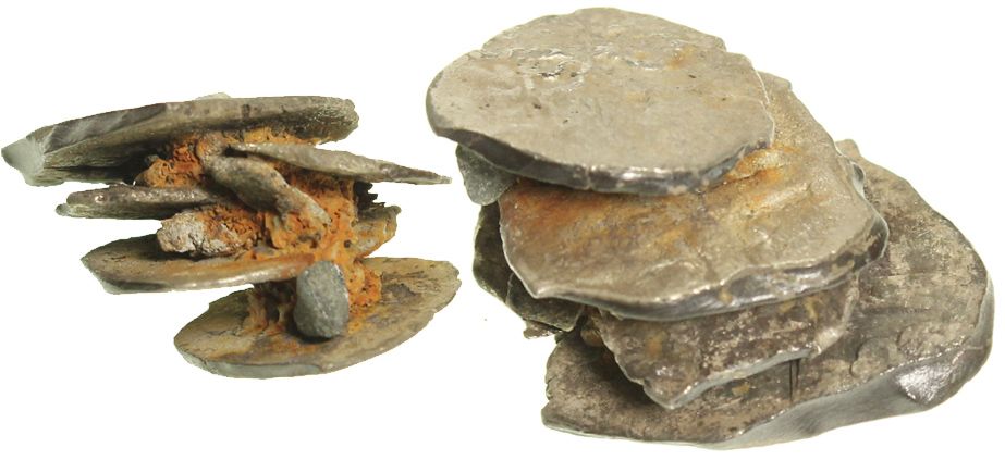 Small but attractive clump of 5 silver cobs (Lima and Potosi, one 4R, two 2R and three 1R) with small pebbles and encrustation. 20.8 grams. Slightly leaning stack with orange crud and small pebbles between the coins, which are not readable except for a Lima 1R 1733 at one end. Recovered from: Princess Louisa, sunk in 1743 off the Cape Verde Islands, west of Africa