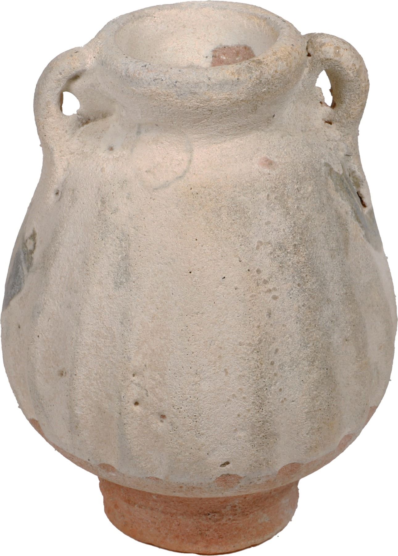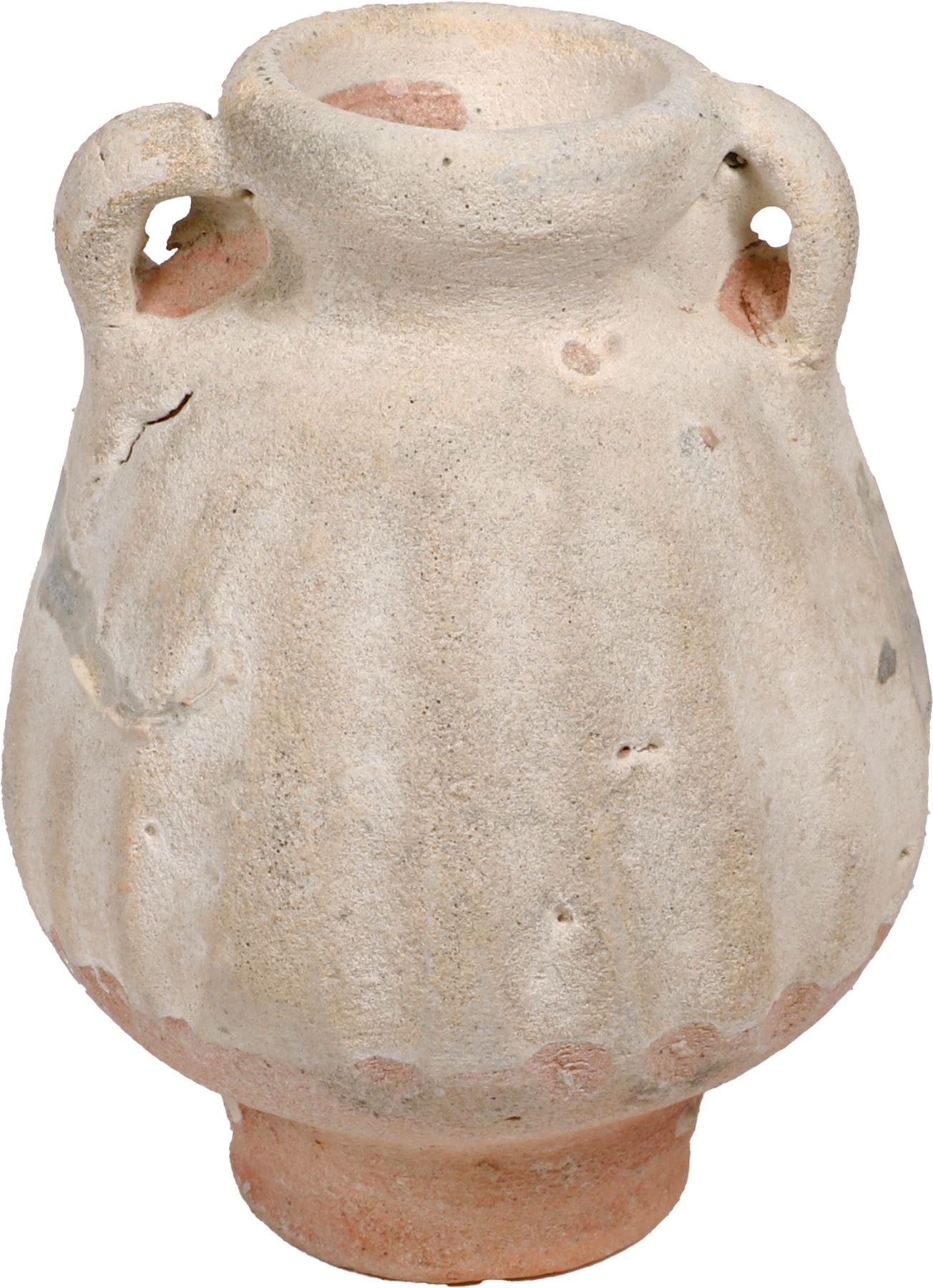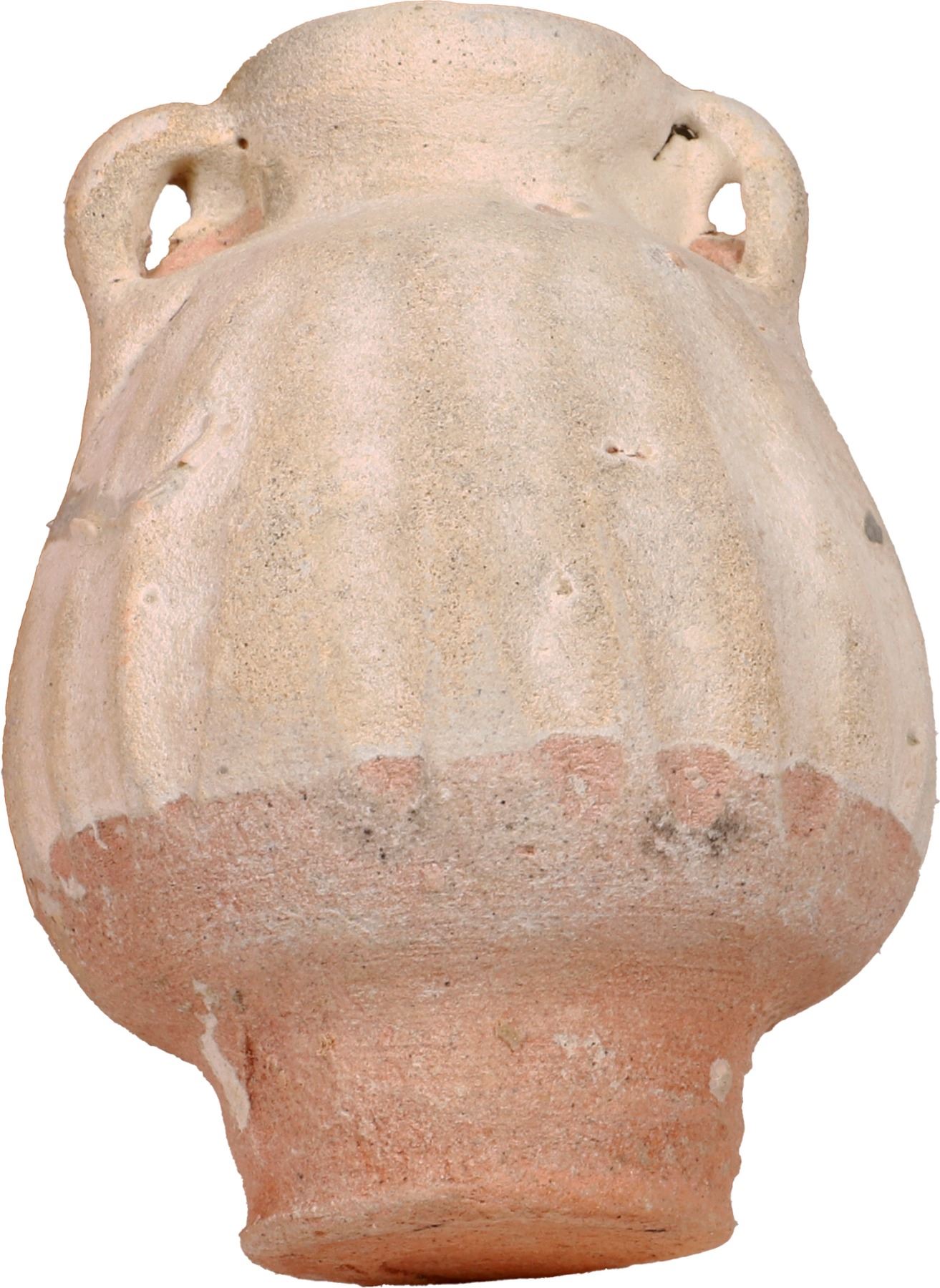 Small celadon jarlet, Sisatchanalai (Thailand), ex-"Royal Nanhai" (ca. 1460). 138 grams. 3" tall. Unglazed bisque finish with pinkish ceramic underneath, vertical ribs around, two handles on either side of mouth, and bits of shard inside, very attractive for display. The ship was carrying over 20,000 pieces of celadon ceramics when it sank. From the "Royal Nanhai" shipwreck (ca. 1460).
