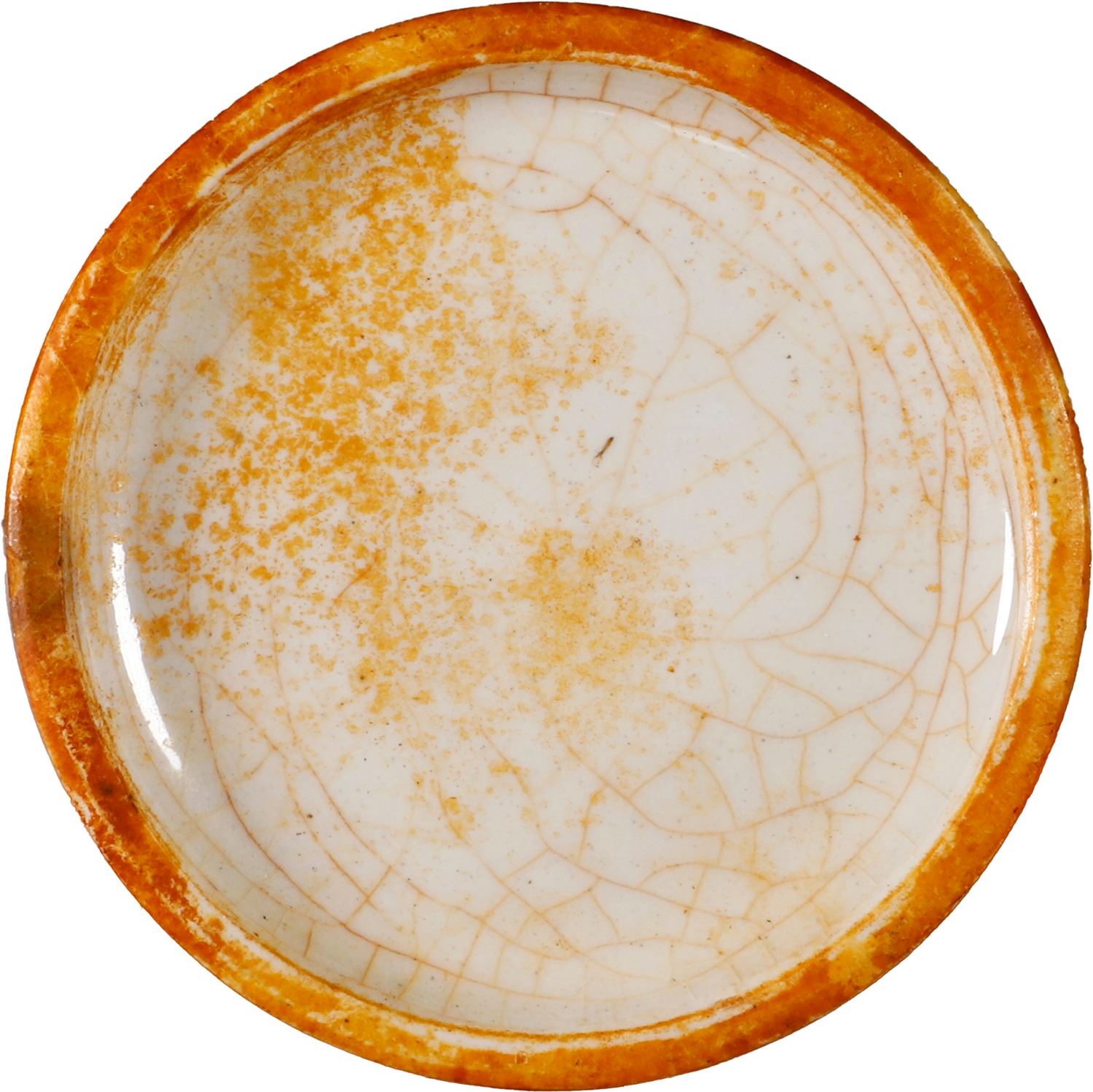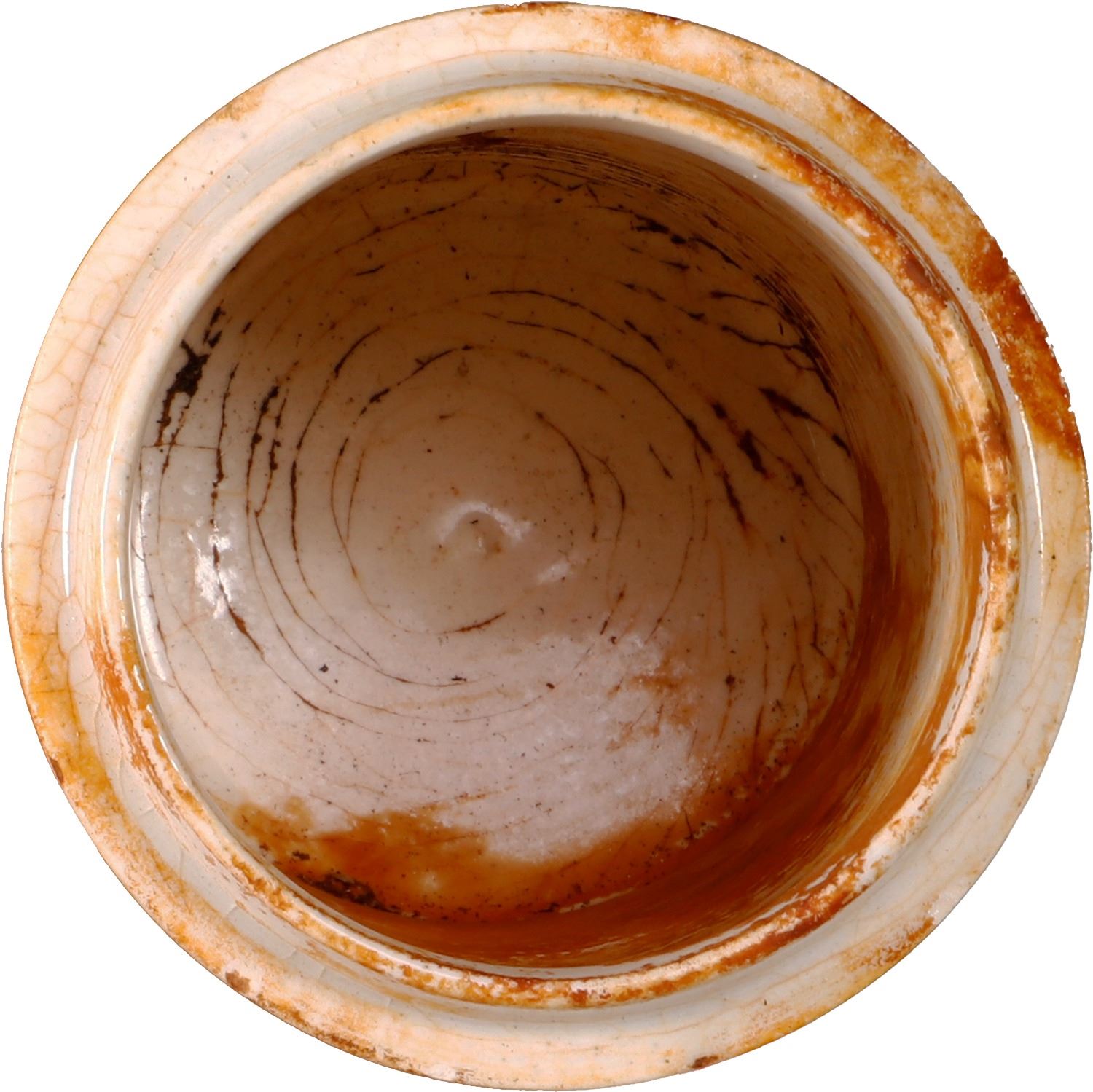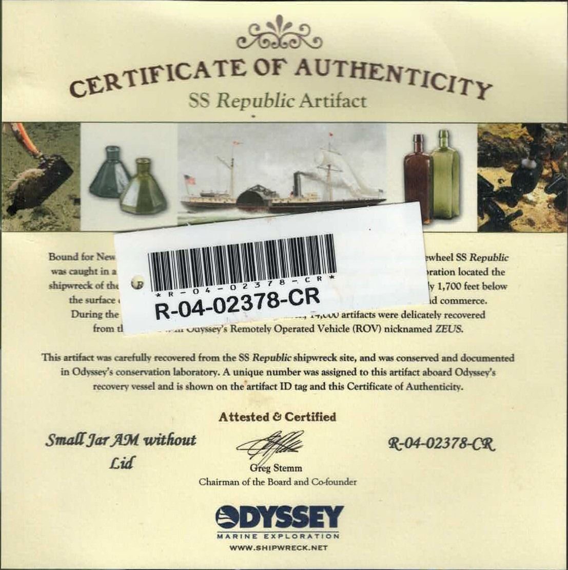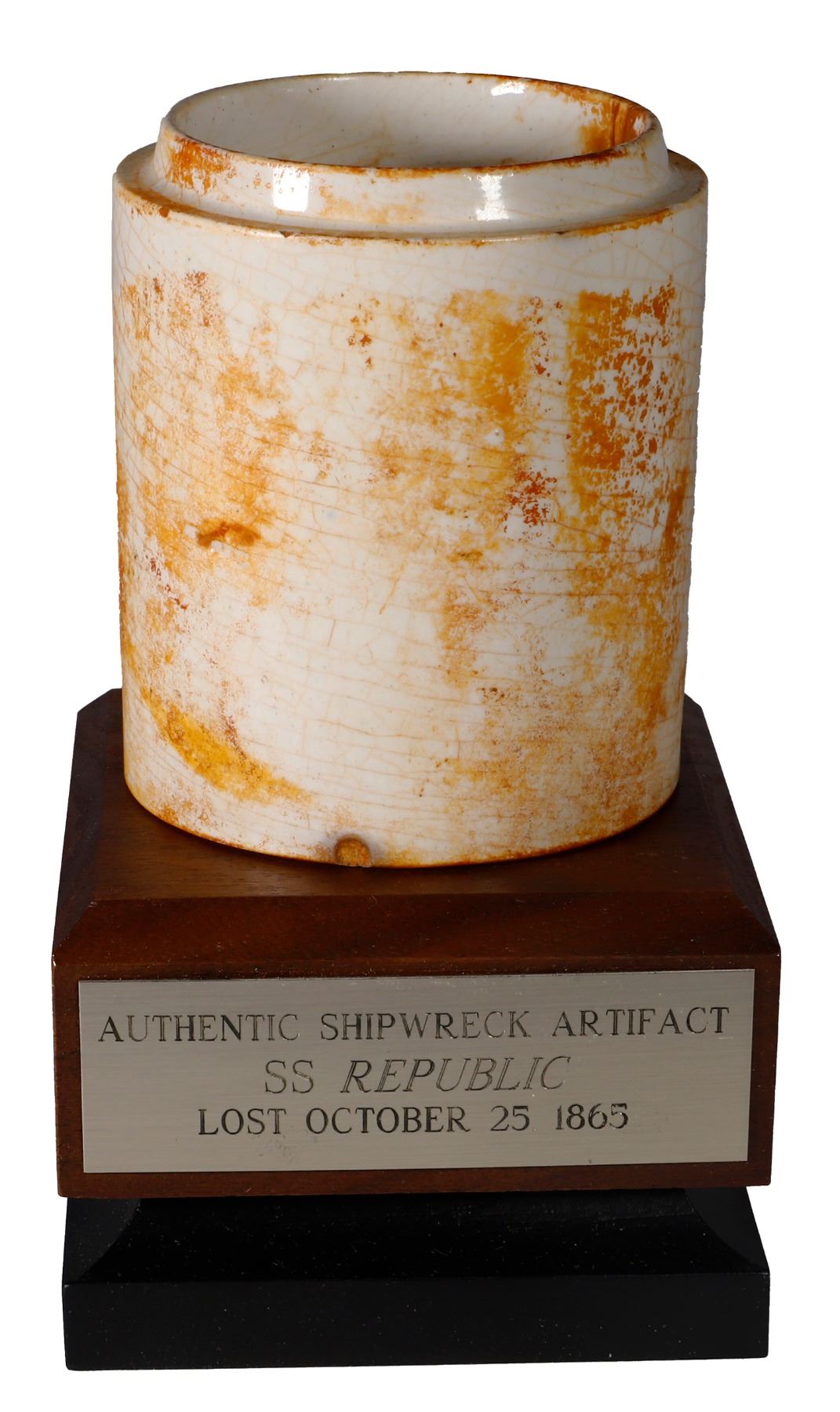 Small ceramic jar without lid, with stand, ex-S.S. Republic (1865). 176 grams. 3" tall, 2½" diameter at base. White with red staining, round ceramic jar without lid, crazing all over but intact. From the S.S. Republic (1865) with original tag and certificate R-04-02378-CR from the salvors.