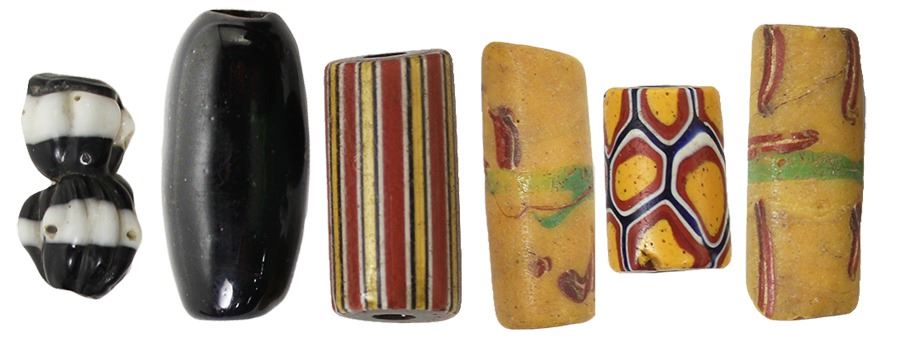Small collection of six glass trade beads, Spanish colonial (1500s-1700s), various types.