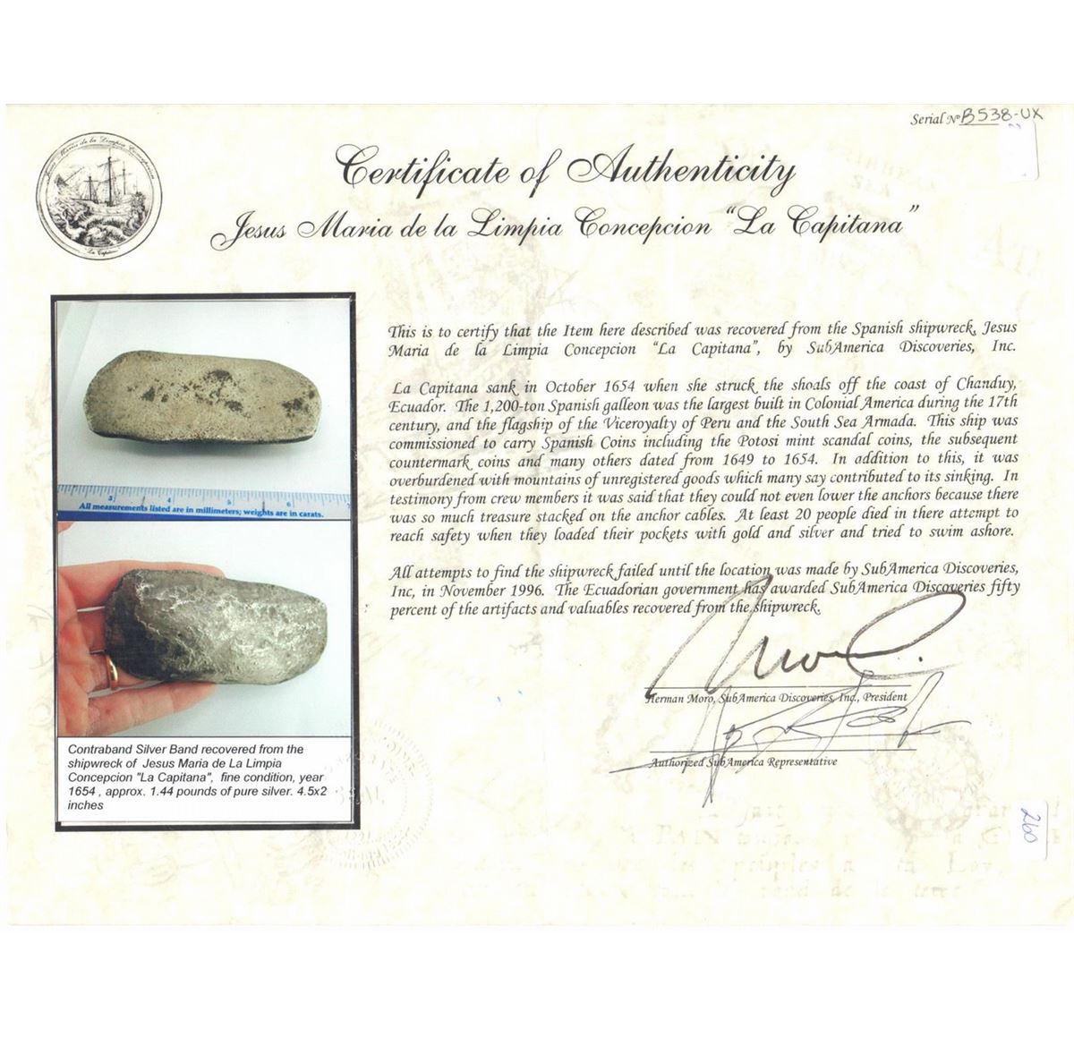 Small, contraband silver bar, 652 grams, from the Capitana (1654). 4-1/4" x 2" x 5/8". No markings but typical shape (somewhat rectangular but with rounded sides and bottom), minimal corrosion, the top slightly silvery but the bottom dark and with spot of orangish encrustation. From the Capitana, with original photo-certificate from the salvagers.