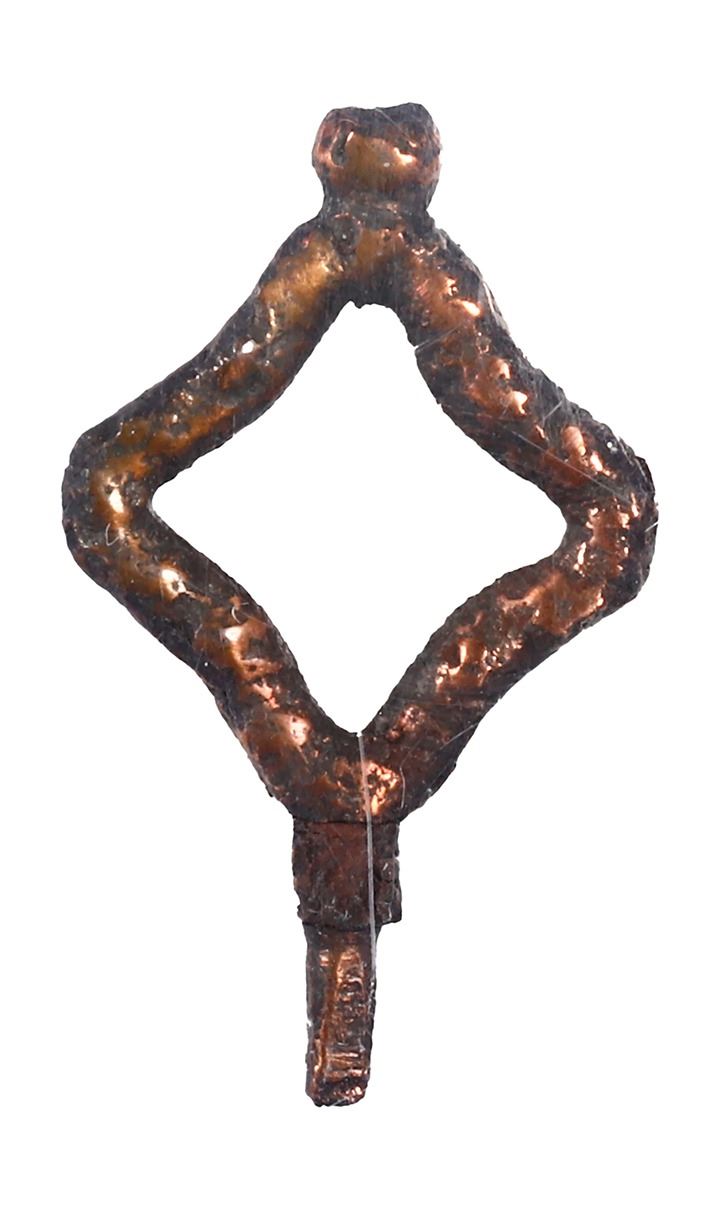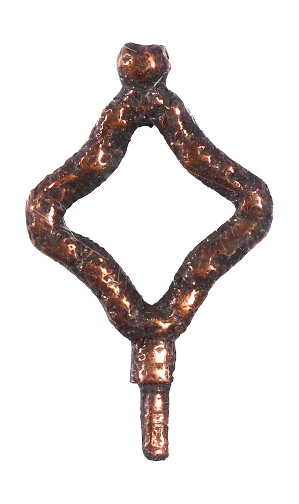 Small copper watch key, ex-Hartwell (1787). 2 grams. 1¼" x ½". Tiny rose-colored key, with a diamond-shaped handle, somewhat pitted but intact. From the Hartwell (1787) with certificate.