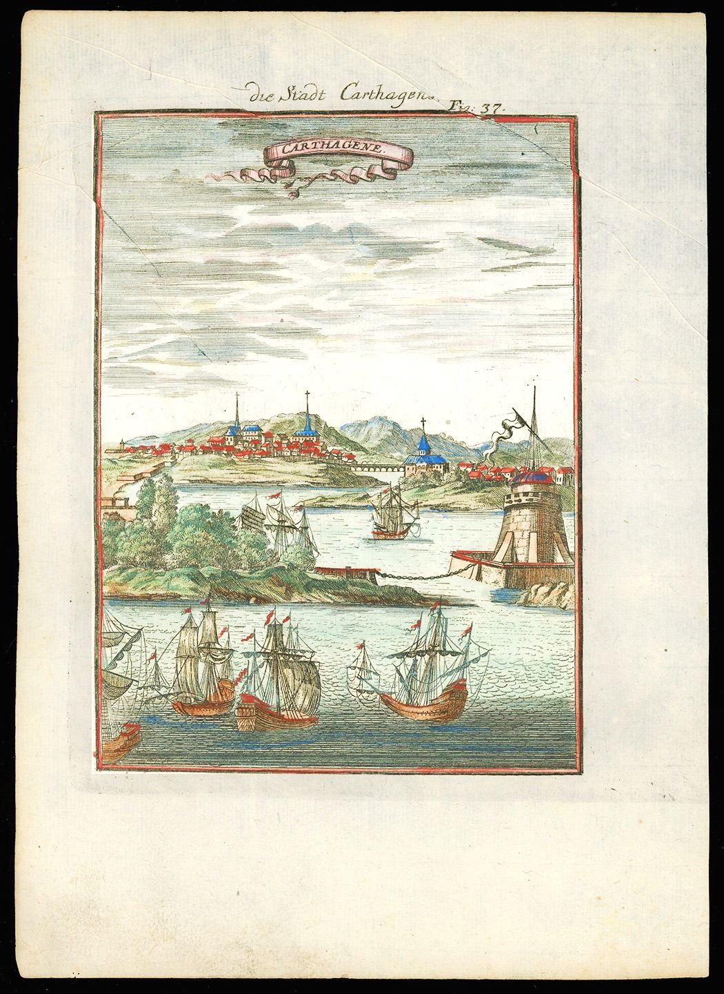 Small copperplate engraving of Cartagena (Colombia) by A.M. Mallet (published 1719), hand colored.
