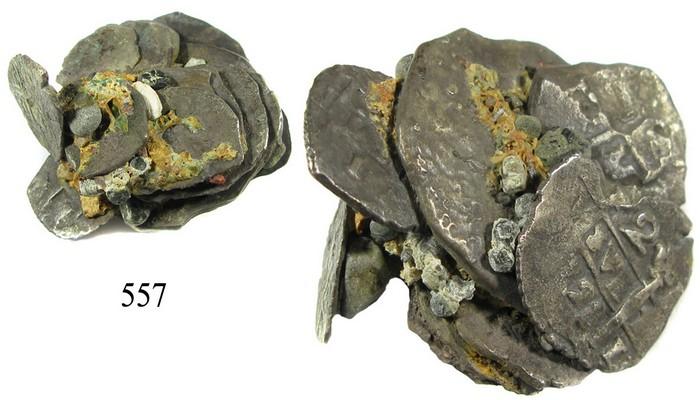 Small, dense clump of 13 small, silver Spanish colonial cobs. 69.6 grams. This attractive display is jam-packed with cob minors, the largest of which is a 4R in the center, with a Lima 2R 1728 on the bottom and various 1R sticking out the top and side, the main stack mostly 1R and ½R, with several pebbles and shells of different colors intermixed. Recovered from: Princess Louisa, sunk in 1743 off the Cape Verde Islands, west of Africa.