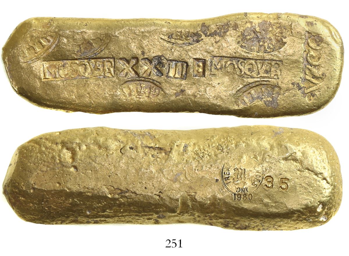 Small, flat Peruvian gold bar #35, 410 grams, marked with fineness XXIII: (23.5K) and assayer MOSQVE