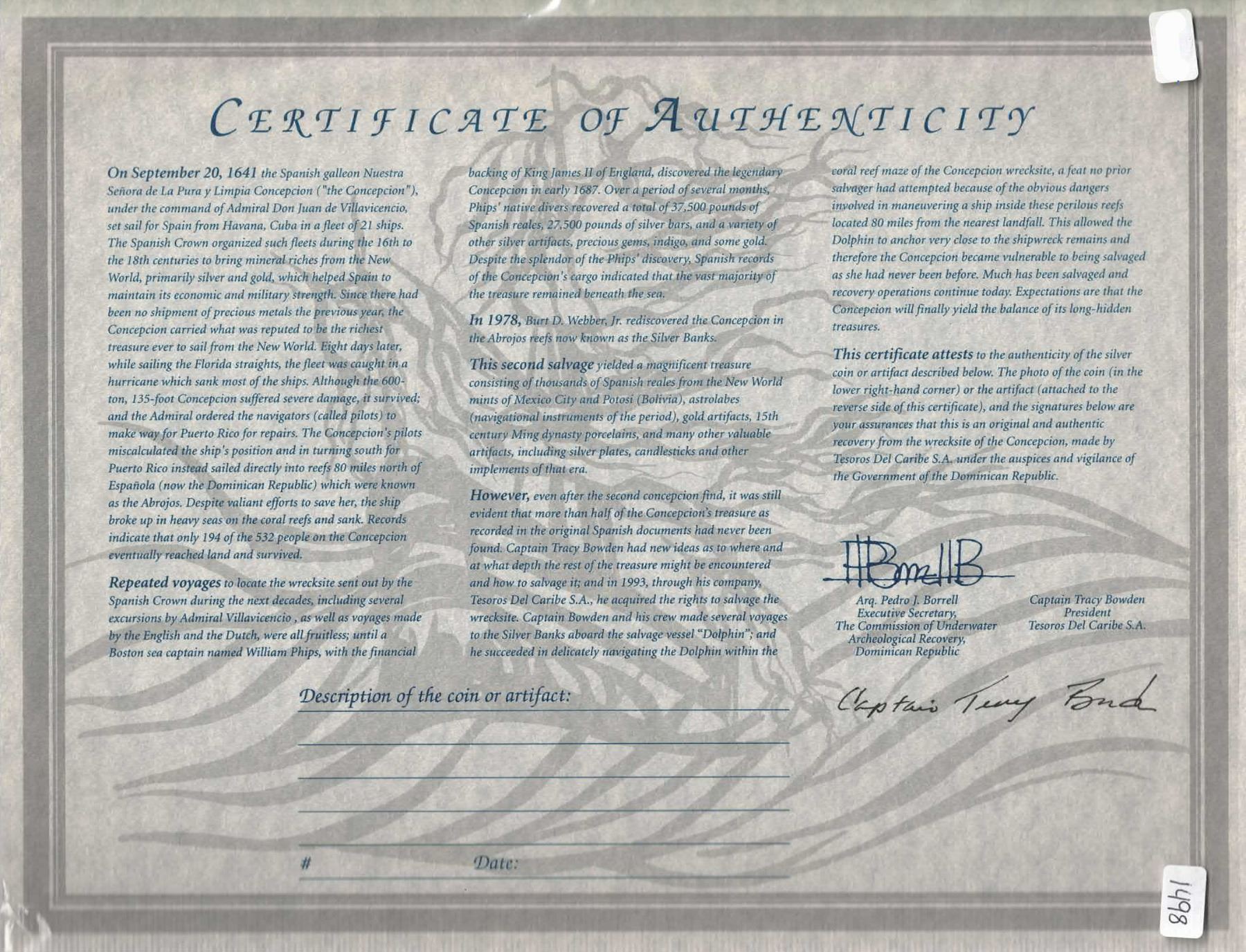 Small fragment of silver plate rim in chunk of coral, ex-Concepción (1641). 78 grams total. Roughly 3" x 2½" x 1¼". Unusual assemblage of a small piece of the rim of a silver plate embedded in whitish coral and shell fragments. From the Concepción (1641), with original certificate from Captain Tracy Bowden through his contract with the Dominican Republic, and accompanied by the July 1996 issue of National Geographic signed by Captain Tracy Bowden on his article "Gleaning Treasure from the Silver Bank."