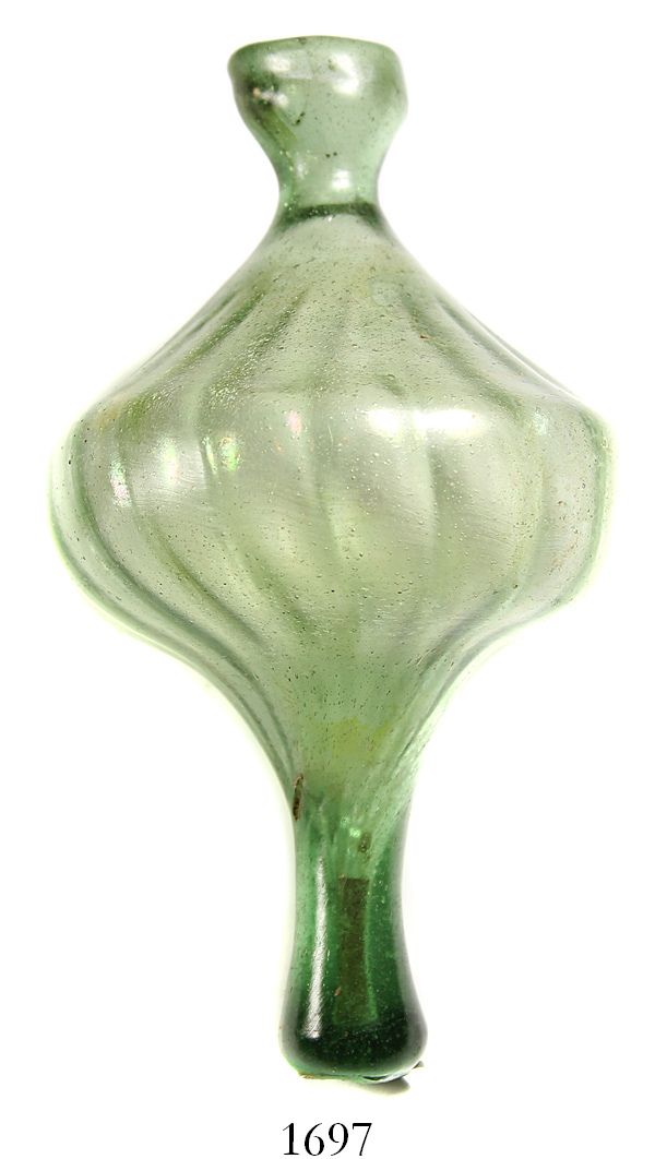 Small, glass bottle (perfume?), Spanish colonial (1500s). 54 grams, 5" long and 2-1/2" at its widest diameter. Strange vessel in green glass with bulb in center and narrow neck and base, slightly ribbed pattern, fully intact and interesting. Found at a colonial site in the southern Caribbean.