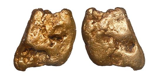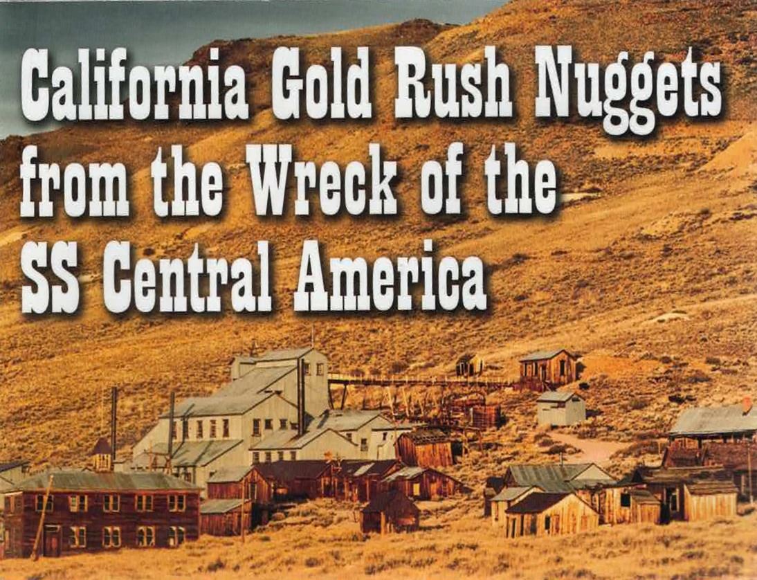 Small gold nugget, 0.54 gram, NGC / SS Central America (California Gold Rush Nugget Label). Up to 8mm. Diamond-shaped "picker" nugget with smoothed surfaces from eons of tumbling in rivers. From the S.S. Central America (1857), with promotional flyer.