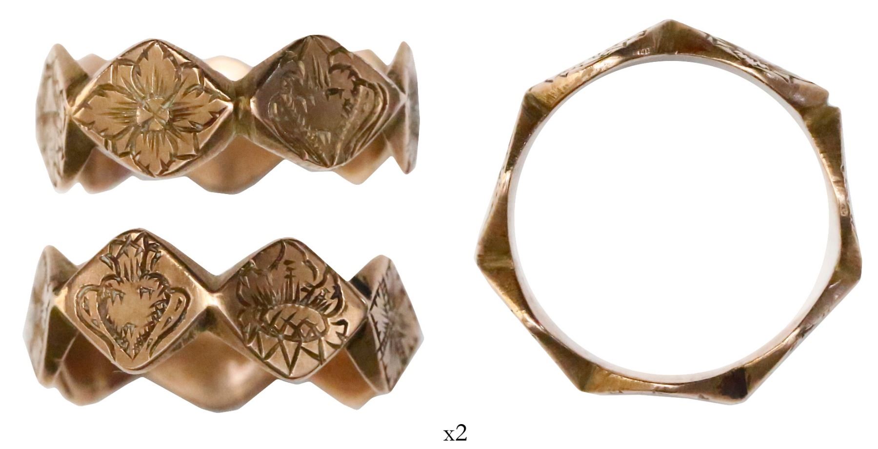 Small gold ring (size 3) with seven-panel design of sacred hearts and flowers, from the 1715 Fleet.