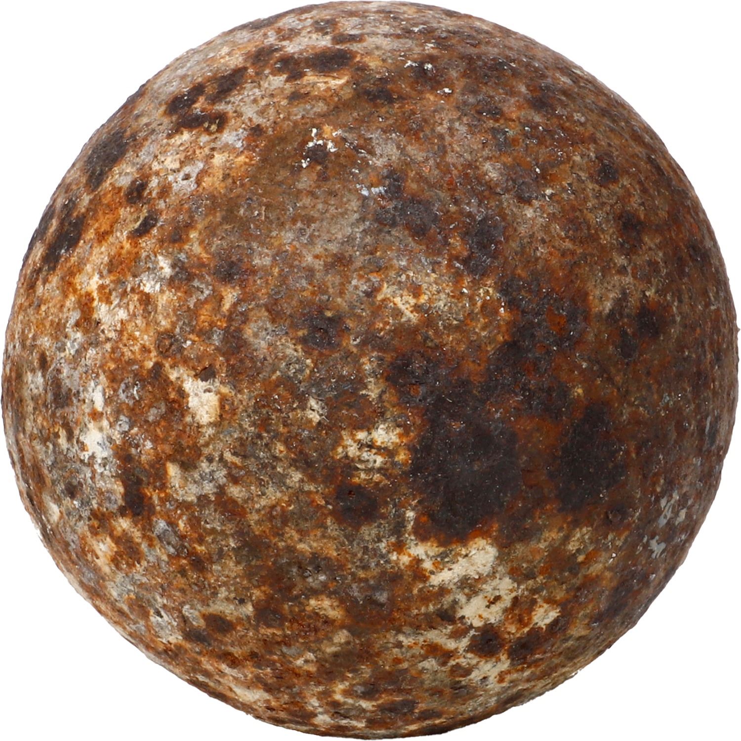 Small iron cannonball, 1700s. 1124 grams. 2½" in diameter. Hand-sized ball, mottled with rust stains all over but solid and intact, reportedly found in the Florida Keys.