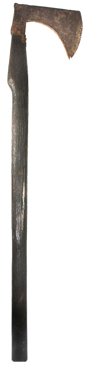 Small iron peat axe with long wooden handle (replaced), European, 1600s-1700s. 870 grams, 33" long, the blade about 6-1/2" x 5". Heavy blade with straight top and curved bottom, lightly corroded but still mostly silvery in color, with straight, oval, black-wood handle that is true to the original, nice for display. Pedigreed to the Bonhams (San Francisco) auction of November 20, 2007, lot #3148.