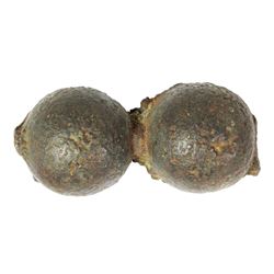 Small iron "sailshot" (barshot), American Revolutionary War, from a Boston collection (rare). 380 grams, 3" long, 1-1/4" in diameter. Very small barshot, almost like two fused grapeshot, said to be like those used by John Paul Jones, each sphere dark brown/black in appearance and made in two parts as per visible seams, intact and somewhat pitted from age.