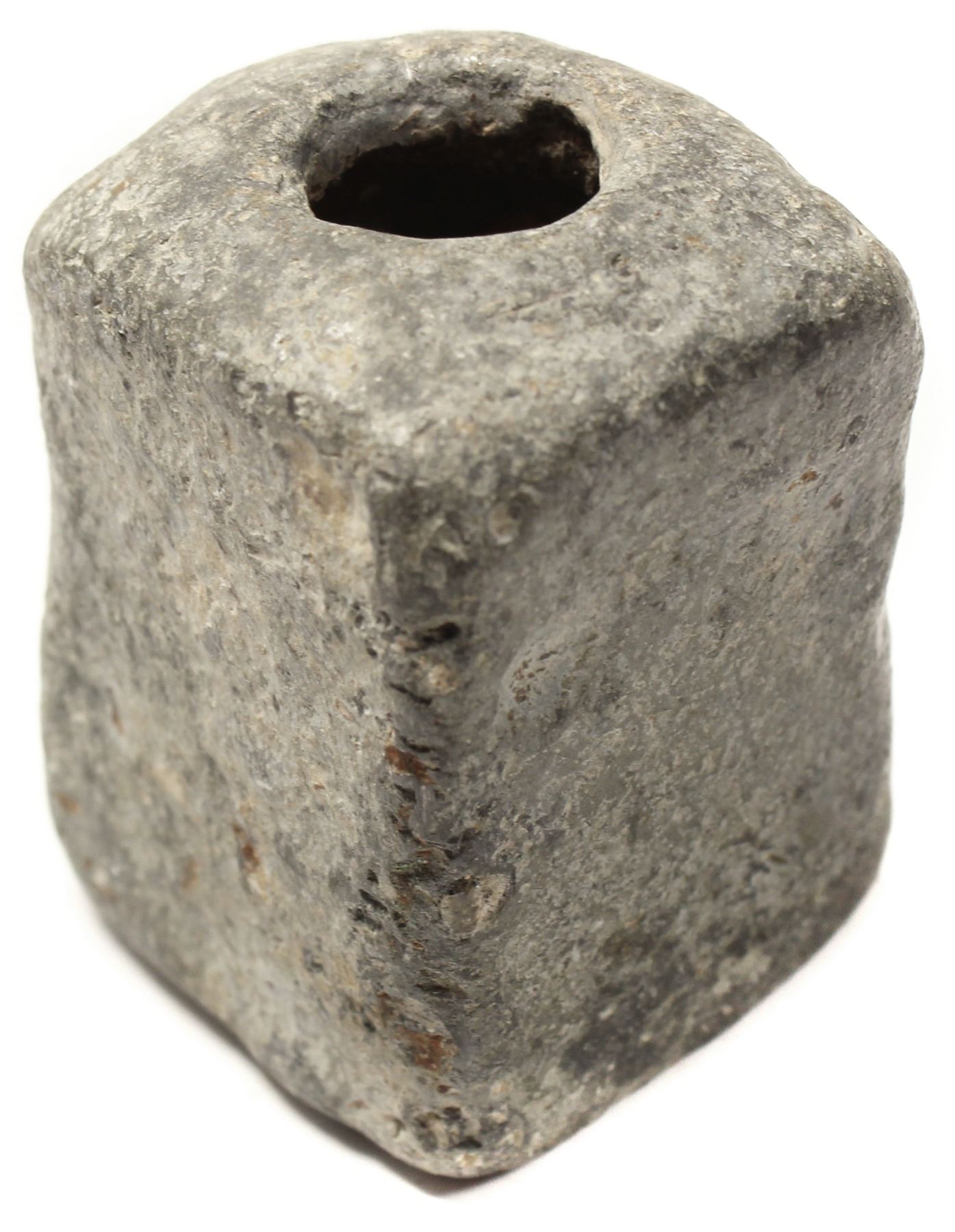 Small lead inkwell from the Tilbury (1757), unique. 183 grams, 1-1/8" x 1" x 1-1/2". Cute, mostly rectangular, small and sturdy inkwell with large hole in top for filling with ink, lacking ornamentation but great for display. From the Tilbury (1757), with original certificate from the consignor.