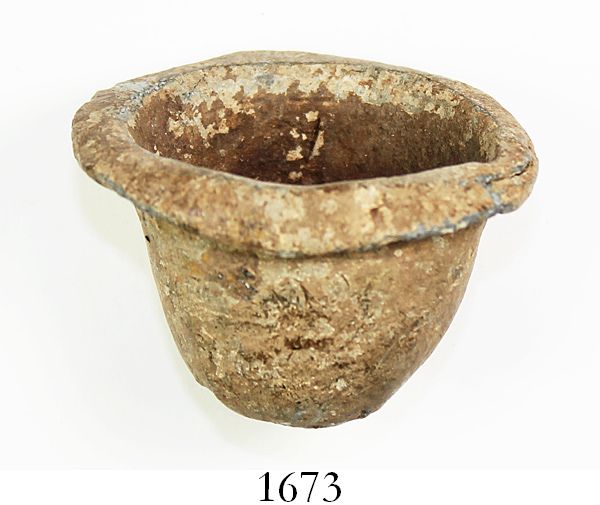 Small, lead, powder-measure (cup), very rare provenance. 52.13 grams, roughly 1-1/2" x 1-1/4" x 1". This item looks like a tiny, tan bowler hat, slightly pushed in on one side, but is actually a cup for measuring out a quantity of gunpowder, probably a rare artifact but virtually unique in its provenance anyway. With original certificate from the salvagers. Recovered from: HMS Eagle, sunk with the Association in 1707 off the Scilly Isles, southwest of England