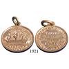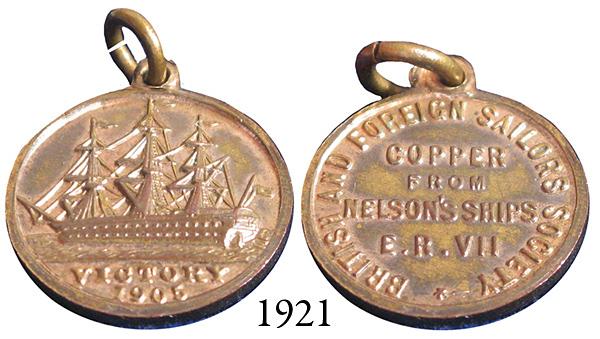 Small medallion commemorating Nelson's HMS Victory (retired from service in 1812), struck in 1905 by the British and Foreign Sailors Society from copper salvaged from the ship. 2.6 grams, 11/16" in diameter. Cute little souvenir with picture of the ship on obverse above VICTORY / 1905, the reverse showing COPPER / FROM / NELSON'S SHIPS / E.R. VII in center and BRITISH FOREIGN SAILORS SOCIETY around the edge, with loop at top, perfect condition with original copper mint-luster.