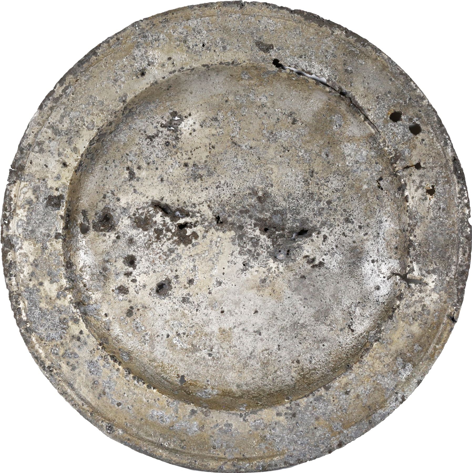 Small pewter plate with maker's mark on bottom, ex-Guadalupe and Tolosa (1724). 286 grams. 8½" diameter. Large-rimmed shallow piece, gray all over with bits of corrosion and small holes, otherwise intact, with stamp on bottom that says LONDON. From Guadalupe and Tolosa (1724), with original certificate from Captain Tracy Bowden through his contract with the Dominican Republic and copy of the article "Graveyard of the Quicksilver Galleons" by Mendel Peterson from the December 1979 issue of National Geographic signed by Bowden.