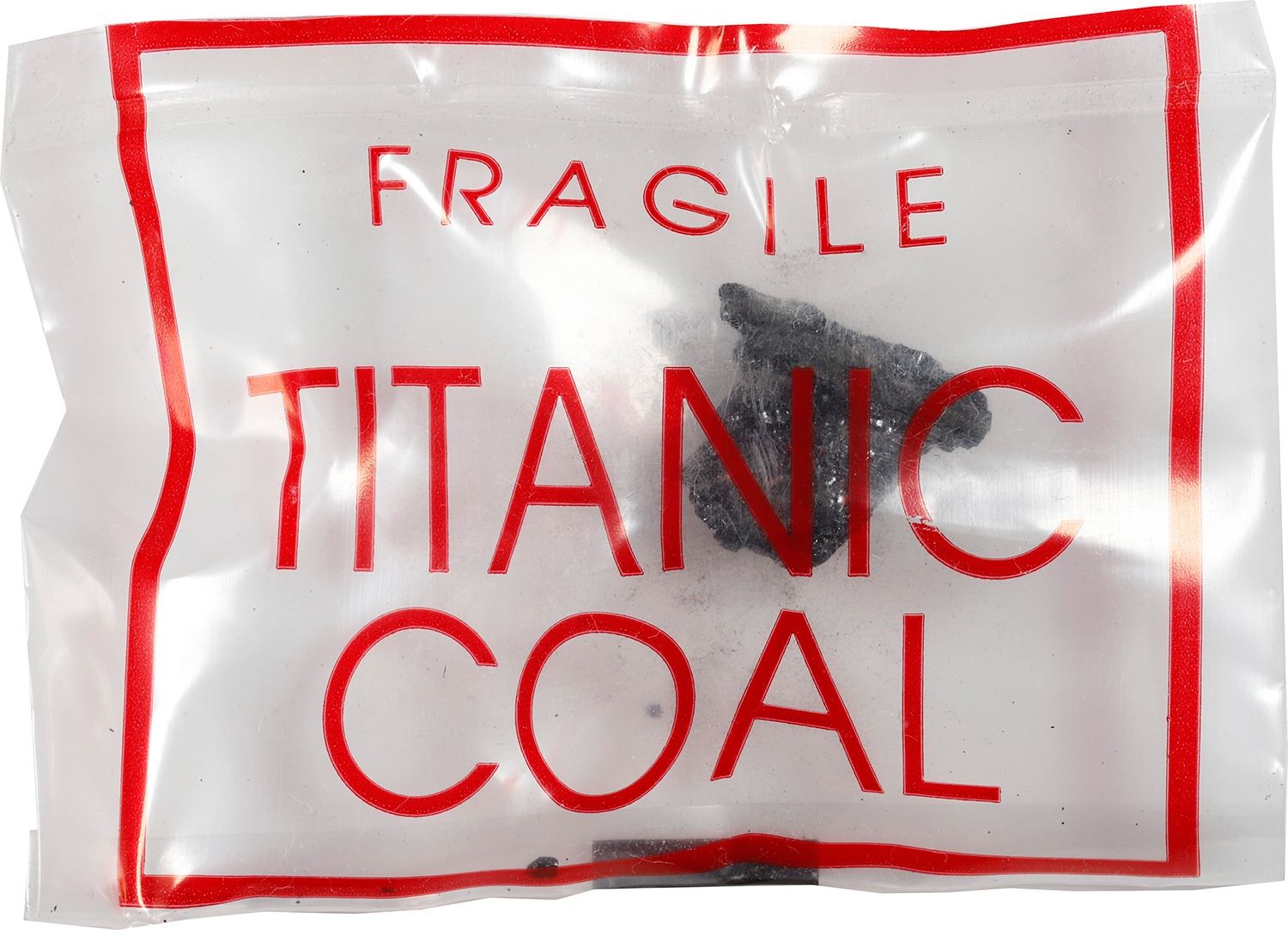 Small piece of coal recovered from the Titanic in 1994, certified as Object No. 94/0036. Roughly 5/8" x 5/8" x ½". Nice size chunk of coal sealed in a plastic bag imprinted with FRAGILE TITANIC COAL. From the RMS Titanic (1912), with custom box and small certificate from the salvors.