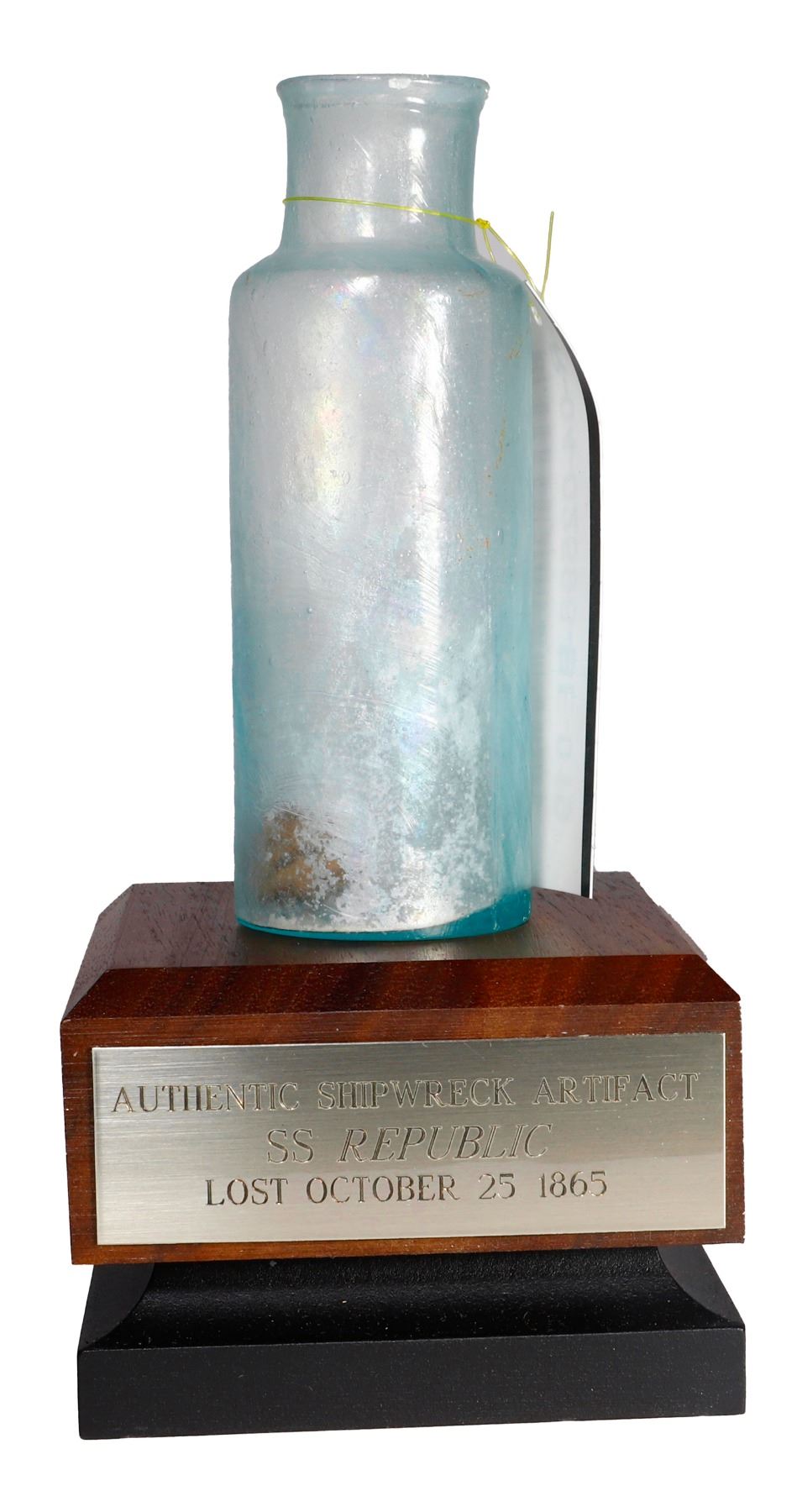 Small round glass medicine bottle, with stand, ex-S.S. Republic (1865). 45 grams. 4" tall, 1¼" diameter at base. Wide-mouthed, light-green glass bottle, delicate and intact, with bit of old cork inside. From the S.S. Republic (1865) with original tag and certificate R-04-02596-BE-019 from the salvors.