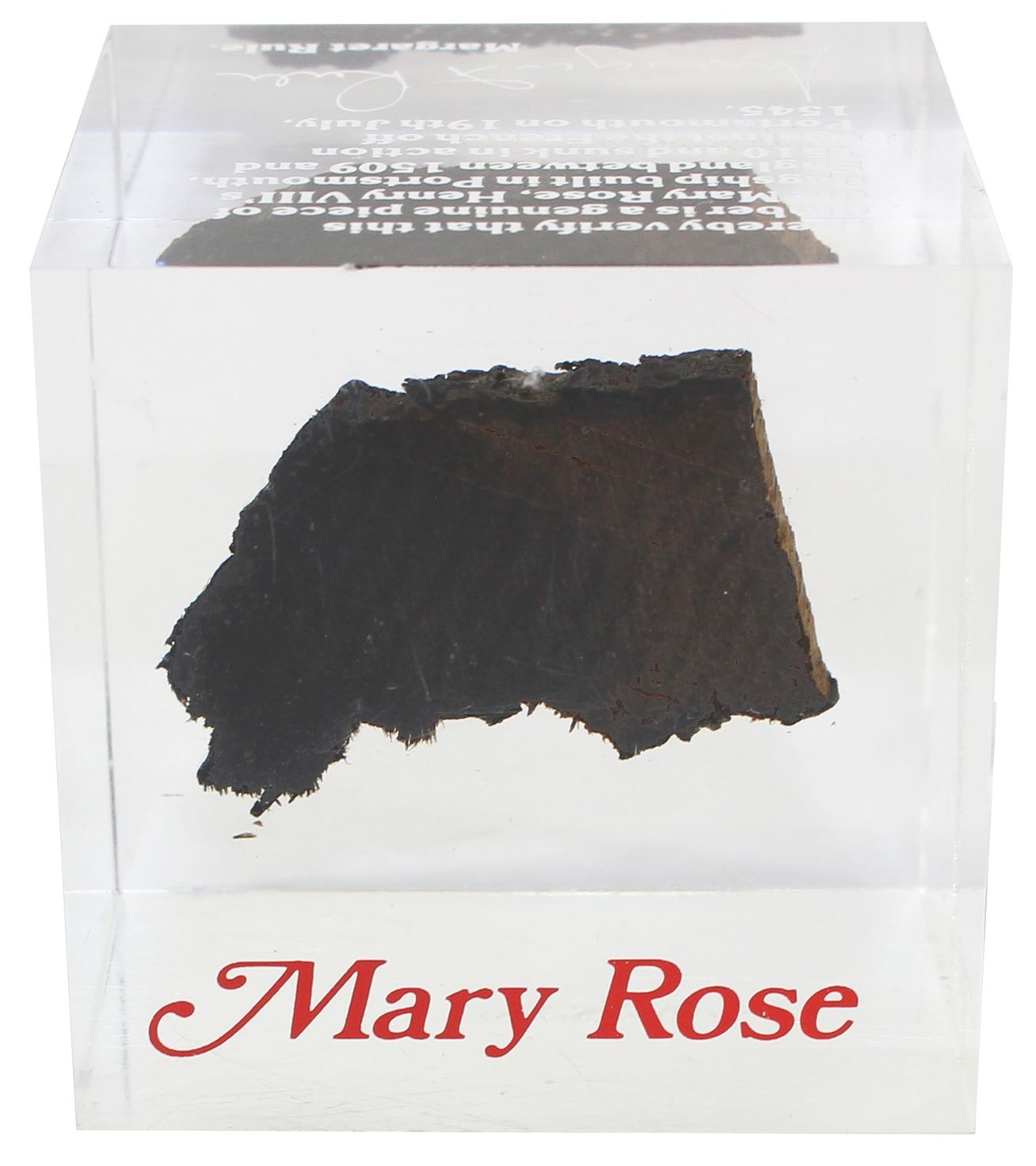 Small section of wooden timber from the Mary Rose (1543) inside an acrylic cube signed by famous archeologist Margaret Rule. 148 grams, 2" x 2" x 2". Henry VIII's flagship Mary Rose, sunk in the Solent north of Isle of Wight, remains one of the most important monuments of nautical archeology, from its discovery in 1971 to its salvage in 1982, its hull and artifacts still on display locally and still being researched and conserved. From the Mary Rose (1543).