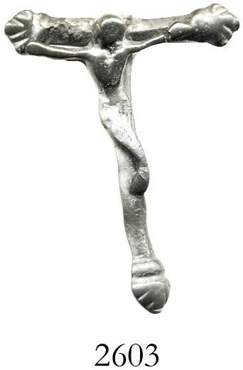 Small silver crucifix (Spanish, 1600s?), found in Seville harbor. 3.0 grams, 1" x 1-1/2". Thin-armed cross with separately molded Christ figure (full) applied, top arm of cross and suspension loop missing but otherwise intact.