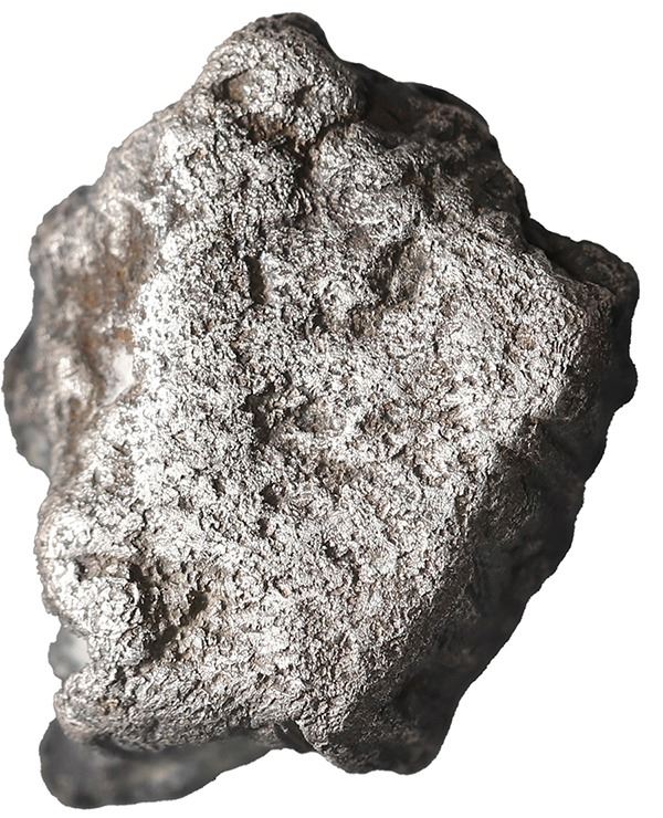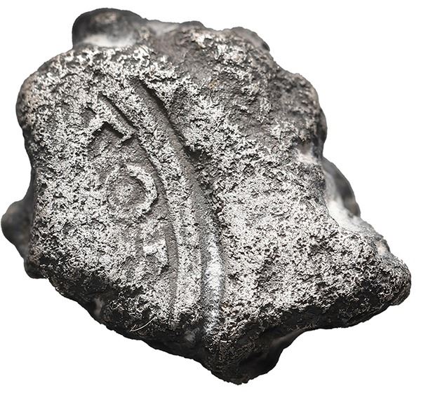 Small silver "plata corriente" cut piece with partial tax stamp from the early to mid-1500s, 10.96 grams, about 96% fine. Roughly 5/8" x ½" x ¼". Thick little chunk of silver, crudely broken from the interior of a "splash" ingot and stamped on one side with a circular seal showing legend letters TOR (probably from the same CAROLVS IMPERATOR seen on "tumbaga" silver ingots, in reference to Charles V, Holy Roman Emperor), with minimal oxidation on surfaces, toning around details, and brownish encrustation in crevices, XRF tested at about 96% silver with 2% lead. Pedigreed to Sedwick Auction 26, with original lot-tag 101.