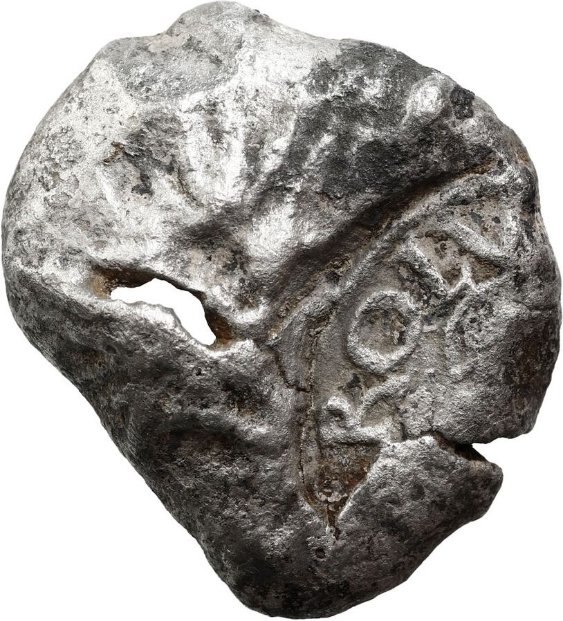 Small silver "plata corriente" piece cut from a "splash" ingot, marked with Charles I tax stamp, 12.