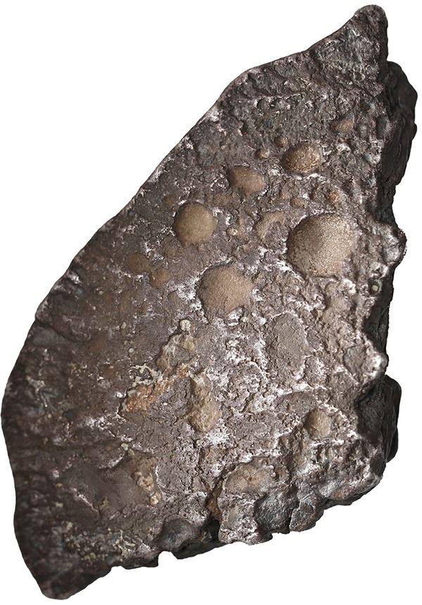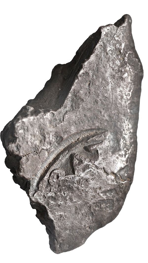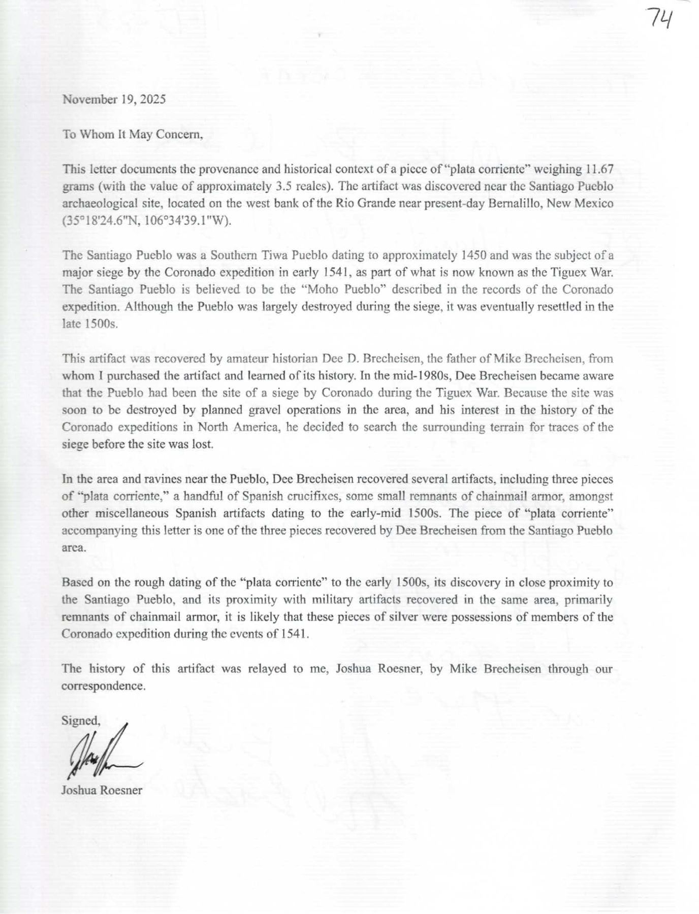 Small silver "plata corriente" piece with partial tax stamp from the early 1500s, 11.67 grams, about 91% fine, found in New Mexico ca. 1985 (very rare provenance). Approx. 1" x ½". Triangular "edge piece" of a "splash" ingot with very deep partial tax stamp showing (G)RAT(IA) in legend, dark but uncorroded, XRF tested at about 91% silver with 5% iridium, 1% lead, and 1% iron. According to the accompanying letters, this typical "plata corriente" piece (used for money before coins were available in quantity in the colonies) was found at the site of the Santiago Pueblo in the Rio Grande River valley near Bernalillo, New Mexico, by amateur archeologist Dee D. Brecheisen in the mid-1980s. Santiago Pueblo was an indigenous community visited by Francisco Vásquez de Coronado in 1541, destroyed in the process but resettled later that century. Coronado was searching for the fabled Seven Cities of Gold, but instead encountered a dozen villages, or pueblos, like this one, peopled by Tiwa-speaking natives, which became known generally as Pueblo Indians. Brecheisen's recoveries at the site included three pieces of "plata corriente" (including this one) and other Spanish items from the early to mid-1500s. With letter from the consignor and provenance statement from the finder's son.
