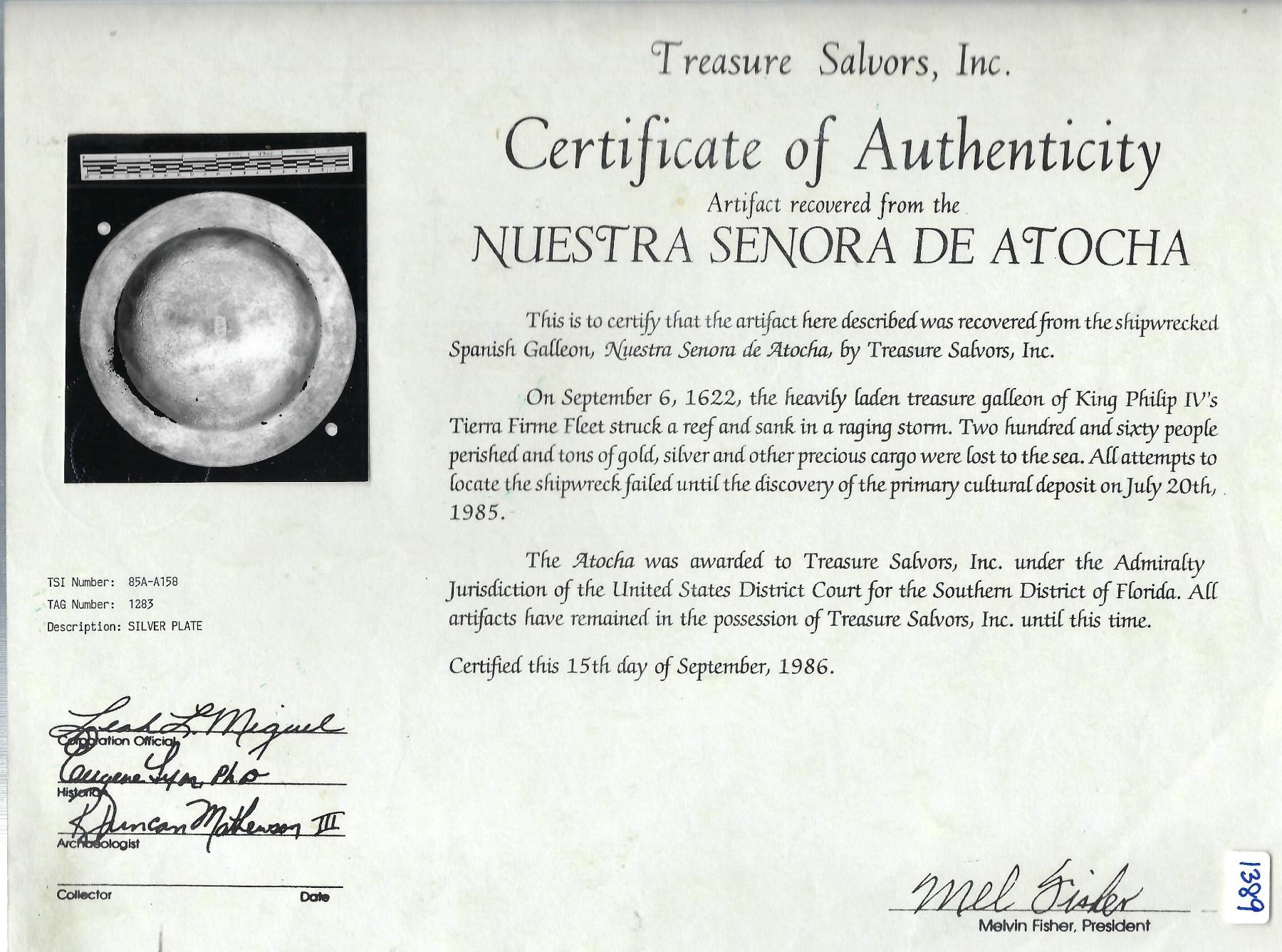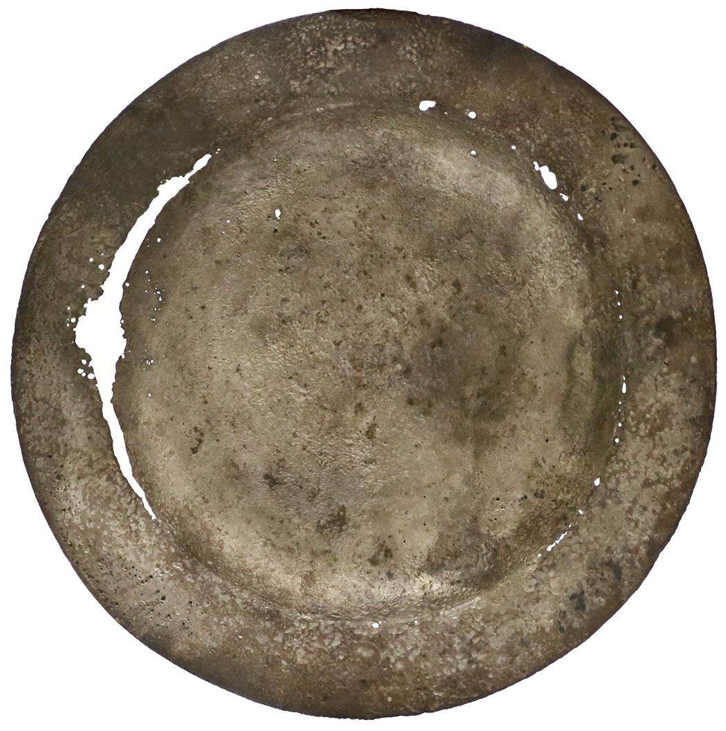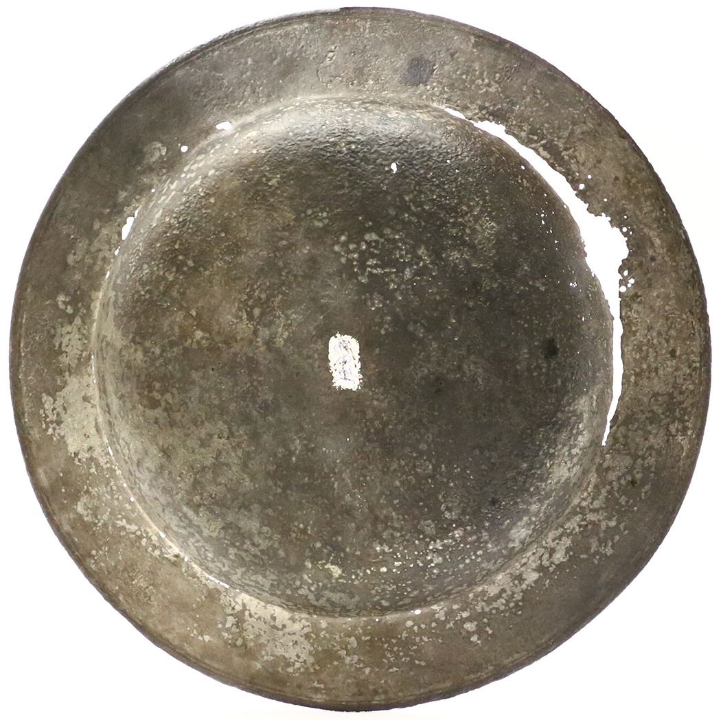 Small silver plate, ex-Atocha (1622). 224 grams, 8-1/2" diameter. Lightweight plate with spots of corrosion around the edge where the bowl and the rim meet, dull gray color with some pitting, desirable provenance. From the Atocha (1622), with original Fisher photo-certificate #85A-A158.