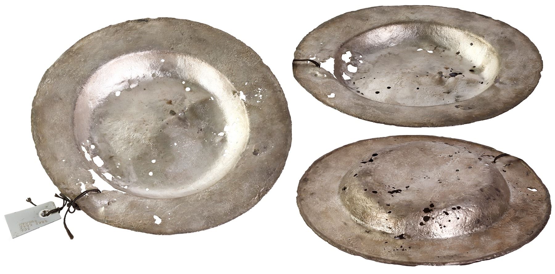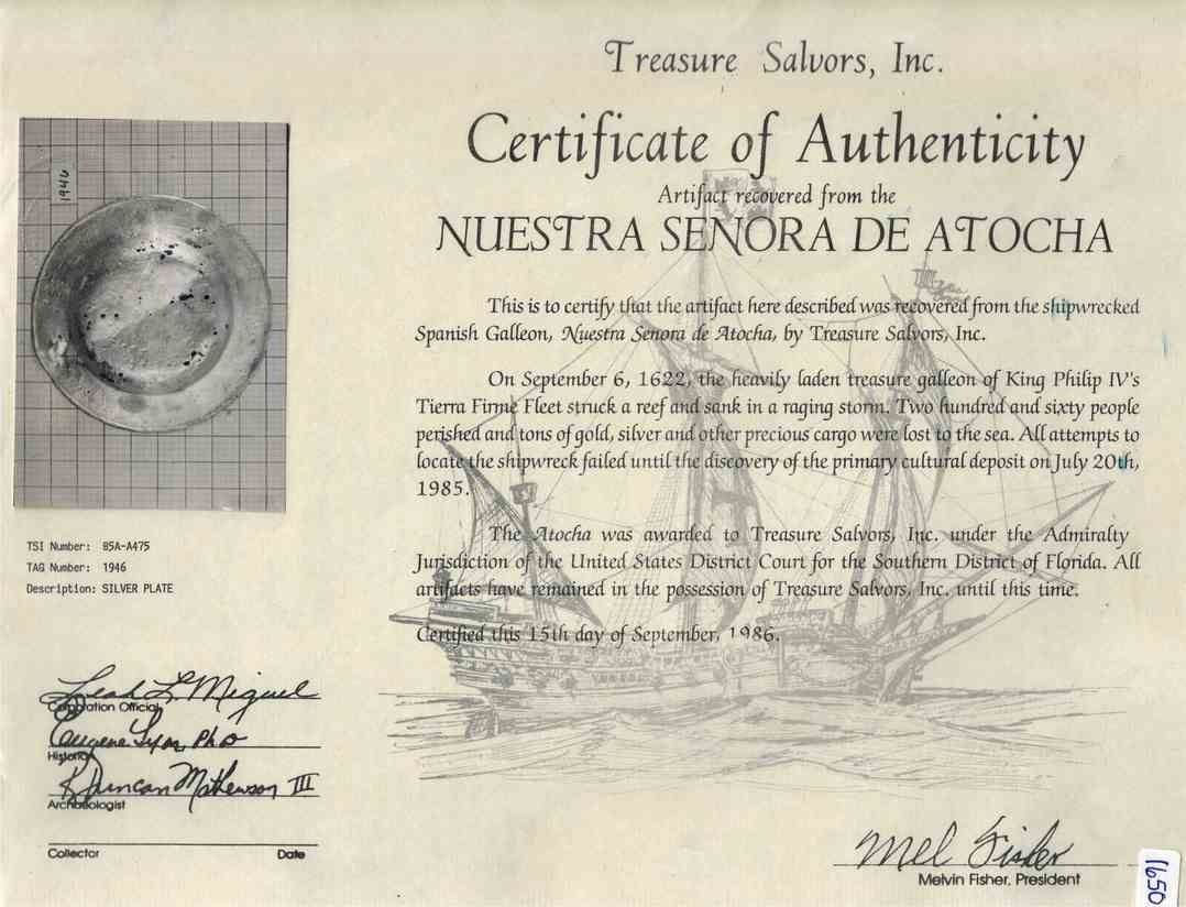 Small silver plate, ex-Atocha (1622). 191 grams. 9" diameter, 1" deep. Bright and shiny, much pitting where silver has worn away, but otherwise intact and attractive, a great piece for display. From the Atocha (1622), with original plastic tag and Fisher photo-certificate 85A-A475, as well as 1986 investor division paperwork.