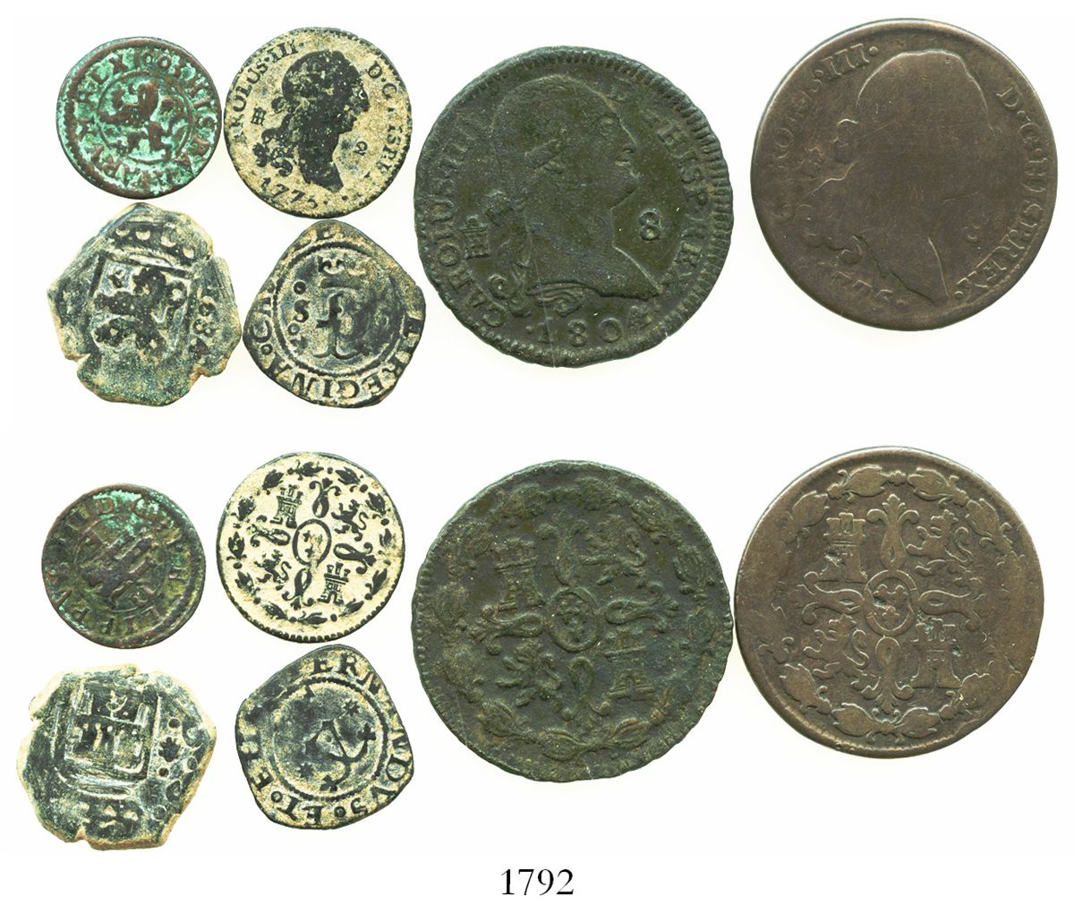 Small type-collection of 6 miscellaneous Spanish copper coins: Ferdinand-Isabel Seville blanca; Philip III Segovia 1 maravedi 1603; Charles II (mint uncertain) 4 maravedis 1684; Charles III Segovia 8 maravedis and 1 maravedi 1775; Charles IV Segovia 8 maravedis 1804. 32.9 grams total. VG to VF, all dark but the smallest ones with tan or green sediment for contrast, the 1804 bold but slightly encrusted.