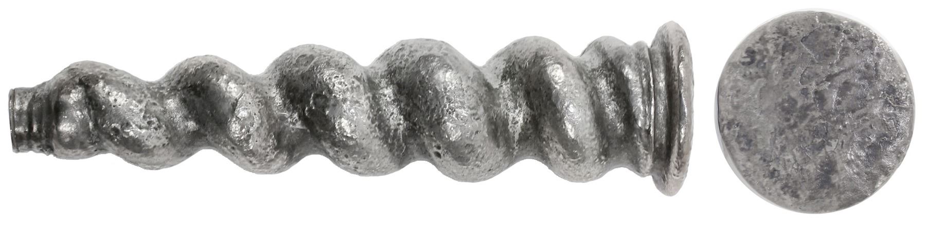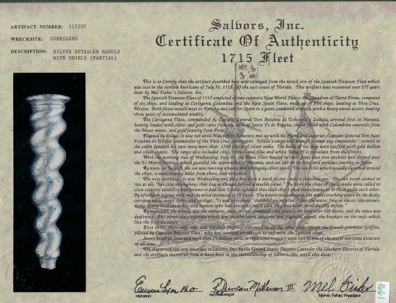 Solid silver coat-of-arms seal with spiral-shaped handle from the 1715 Fleet. 168 grams, 4" long, 1" diameter at base. Attractive, sturdy silver handle with a small, hollow, threaded end on one side and a solid round flat end with an incuse coat of arms (no longer visible) on the other for use as a seal for some important dignitary or officer, mostly intact with a modicum of corrosion. Identical to lot 1600 of our Auction #23 but with coat-of-arms design heavily corroded. From the 1715 Fleet, with Fisher photo-certificate #11535F.