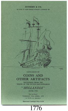 Sotheby & Co. (London), Catalogue of Coins and Other Artifacts Recovered from the Wreck of the Dutch East Indiaman "Hollandia" (Sunk 1743), April 18, 1972. A valuable classic, with listings and photos (some in color) of 503 lots of coins and artifacts from the Hollandia, sunk off the Scilly Isles, England, in 1743 (mint condition).