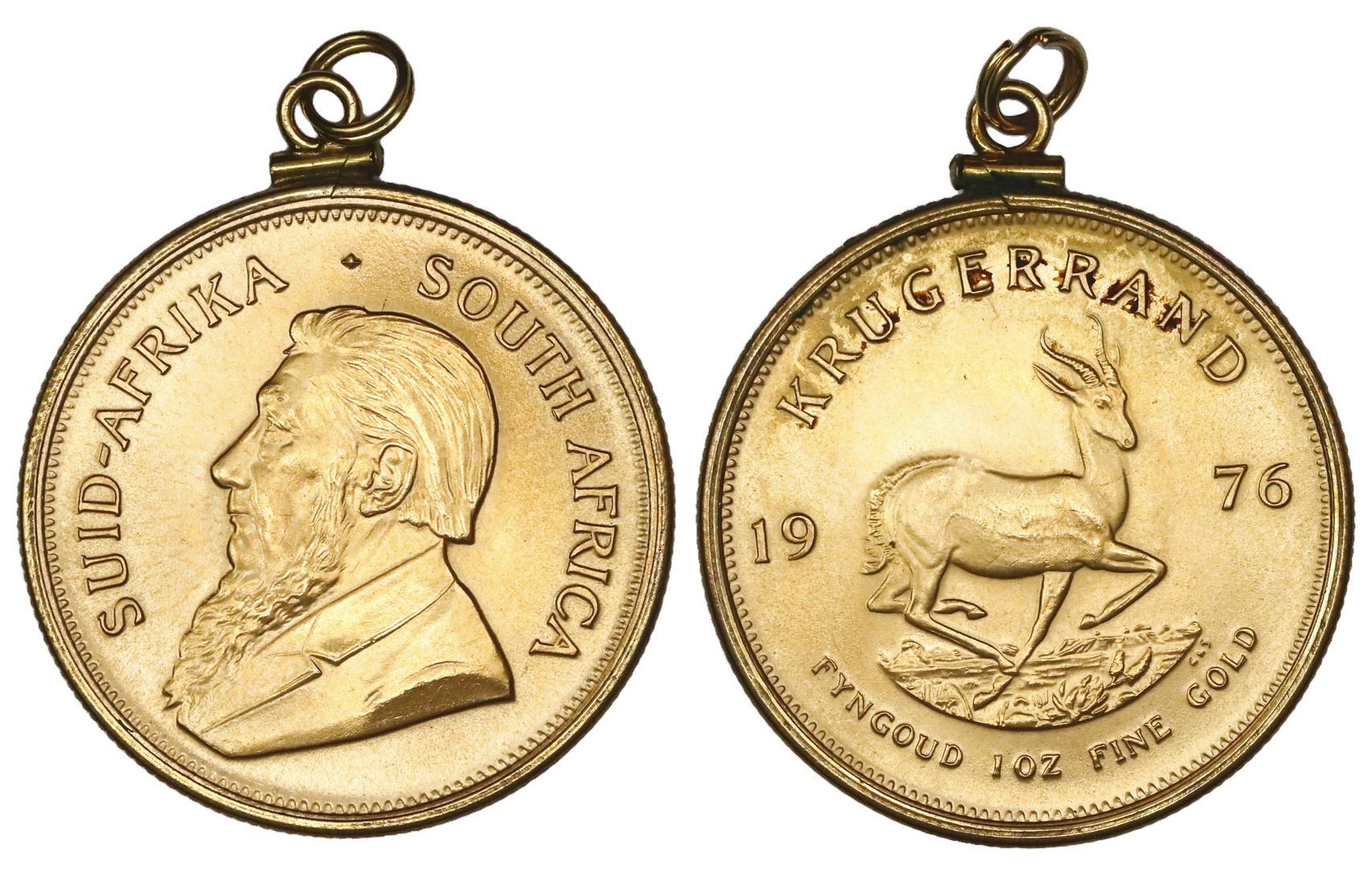 South Africa, gold krugerrand, 1976, mounted in standard (removable) 18K bezel. 35.43 grams total. Matte-UNC coin with luster, no visible damage.