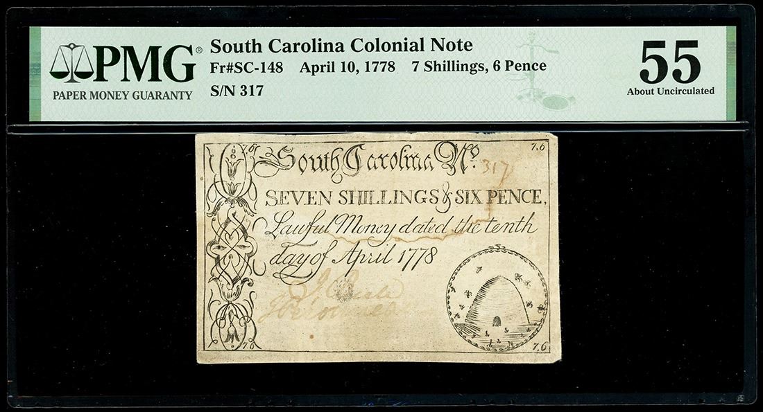 South Carolina, 7 shillings 6 pence, April 10, 1778, serial 317, PMG AU 55, finest known in PMG cens