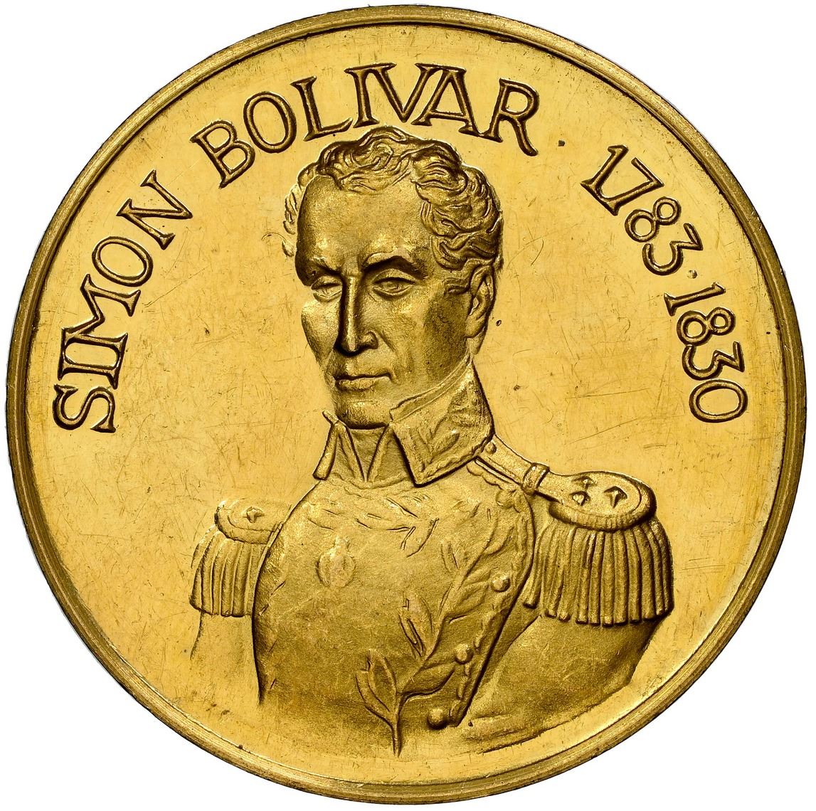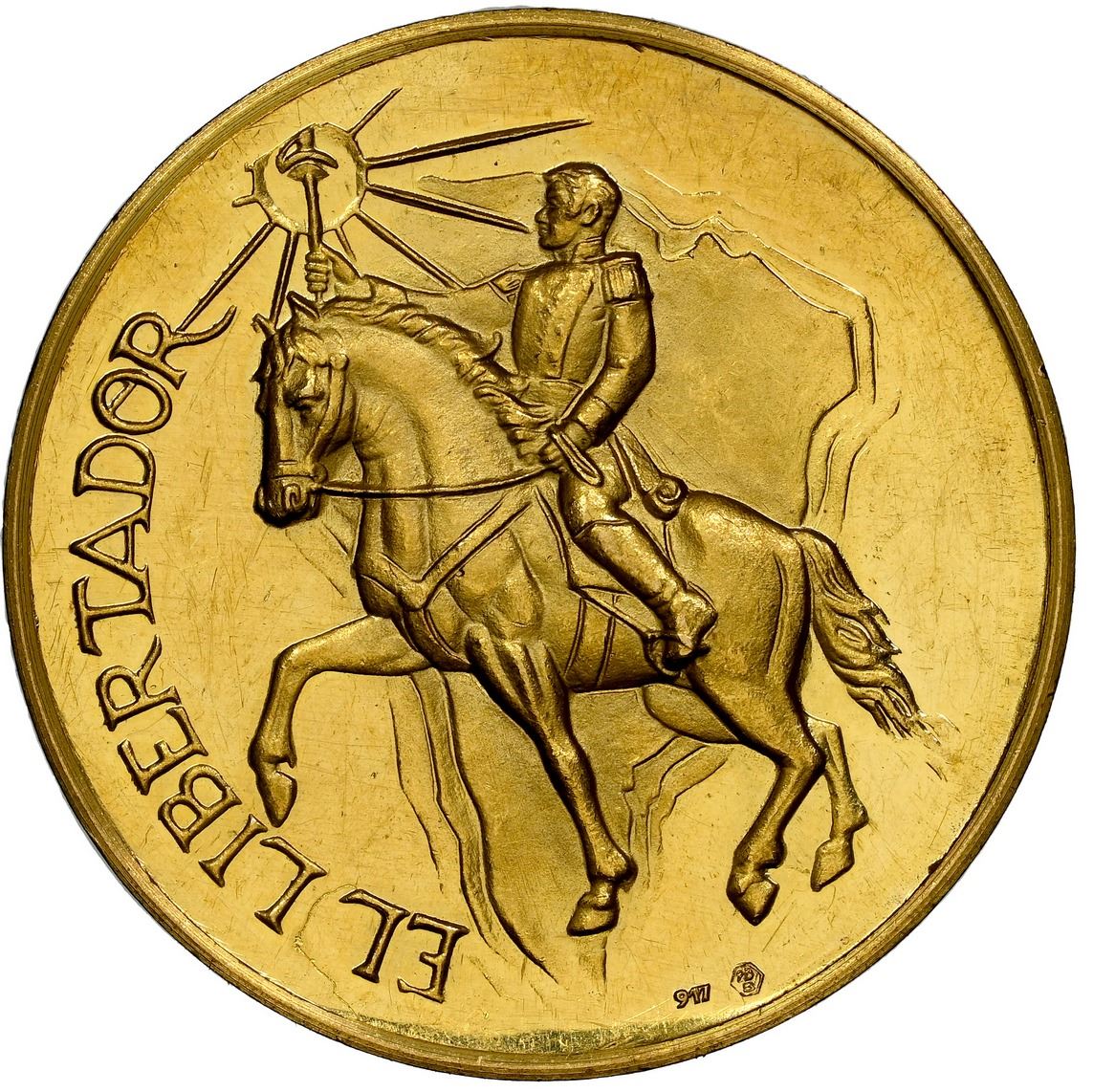Spain, gold proof medal, (1970), inauguration of the Simon Bolivar monument in the Parque del Oeste de Madrid by the Instituto de Cultura Hispanica. 10.42 grams; 28mm. Obverse with uniformed bust of Bolivar below legend SIMON BOLIVAR 1783-1830; reverse with Bolivar on horse, holding sword handle up to the sun, with frosted silhouette of South America in the background, legend EL LIBERTADOR to left, tiny hallmark and fineness marking 917 (22K gold) at bottom. Brightly lustrous UNC with bagmarks and light hairlines, also a curious strike-through-fiber error between EL and LIB.