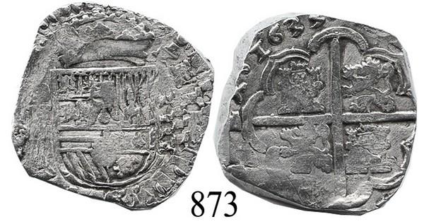 Spain (mint uncertain), cob 4 reales, 1633, assayer not visible, rare. 13.8 grams. Exceptionally bold, full date, with nice full cross and small shield (also full crown and most of king's name), the obverse a bit doubled, Fine for wear, square flan of uneven thickness.
