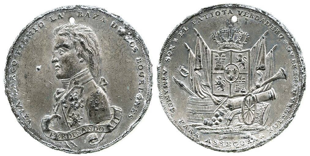 Spain, pewter propaganda medal of Ferdinand VII (ca. 1808-14), rare. 42mm; 15.6 grams. Obverse with bust of king, name on truncation, legend VIVA LARGO TIEMPO LA RAZA DE LOS BOURBONES; reverse with arms, flags and cannon, legend EL PATIOTA VERDADERO / NOS ARMAMOS PARA ASSEGURAR NUESTRA LIBERTAD. Holed as made, lustrous AU with high points darker, of unknown date and origin but clearly an example of Bourbon propaganda from the Napoleonic era, and reportedly one of only 3 specimens known.