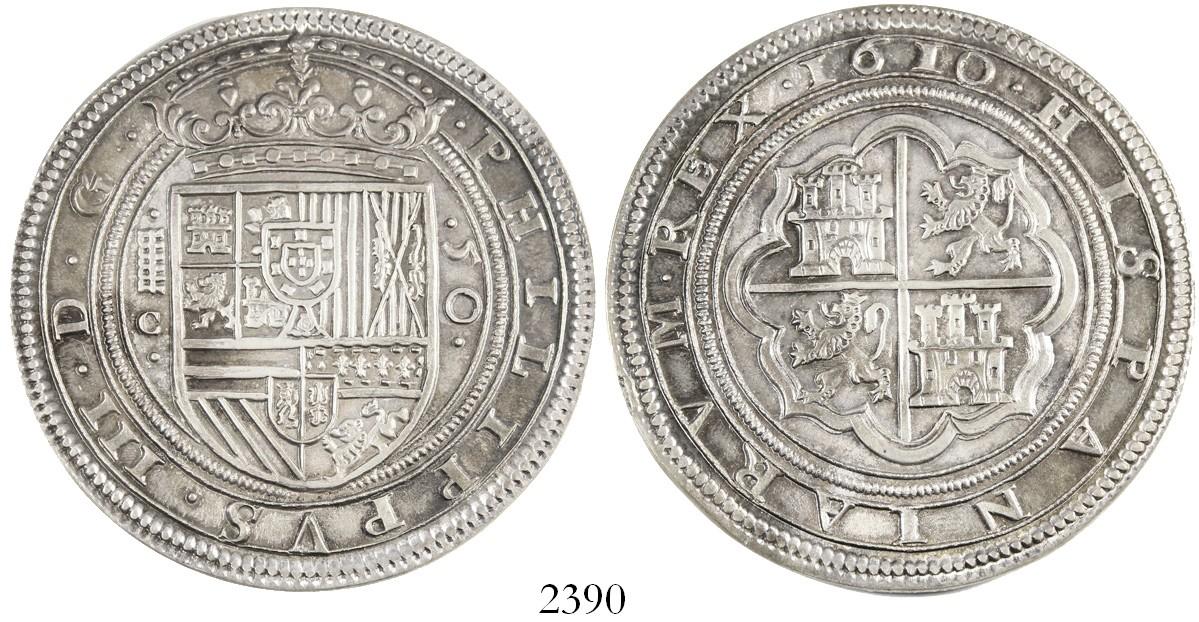 Spain, silver medal (1985) of a Segovia 50 reales (cincuentin) 1610C made from art school dies from Seville. 146.5 grams. Lightly rainbow-toned Mint State, engraved F.A.S. MEDALLA PUERTO RICO 17 and PLATA 999 on the edge.