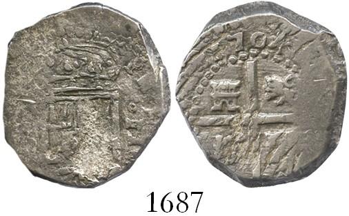 Spain (uncertain mint), cob 2 reales, 1704, assayer not visible. 6.7 grams. Bold date, nearly full but doubled cross and crown, off-center shield, crude AVF.