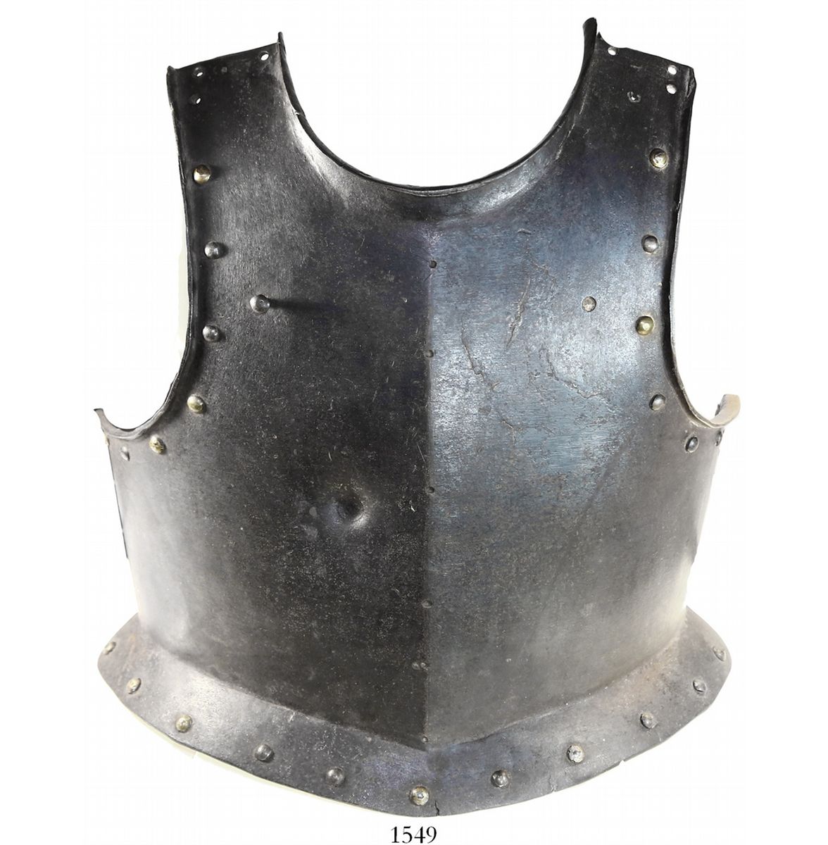 Spanish armor breastplate, 1600s. 4064 grams, 16" tall and 13-1/2" wide. Heavy hand-forged construction with folded-over edge-rim, rivets intact but one top peg missing, with one rather deep dent in breast supposedly from musketball impact, nice patina overall.